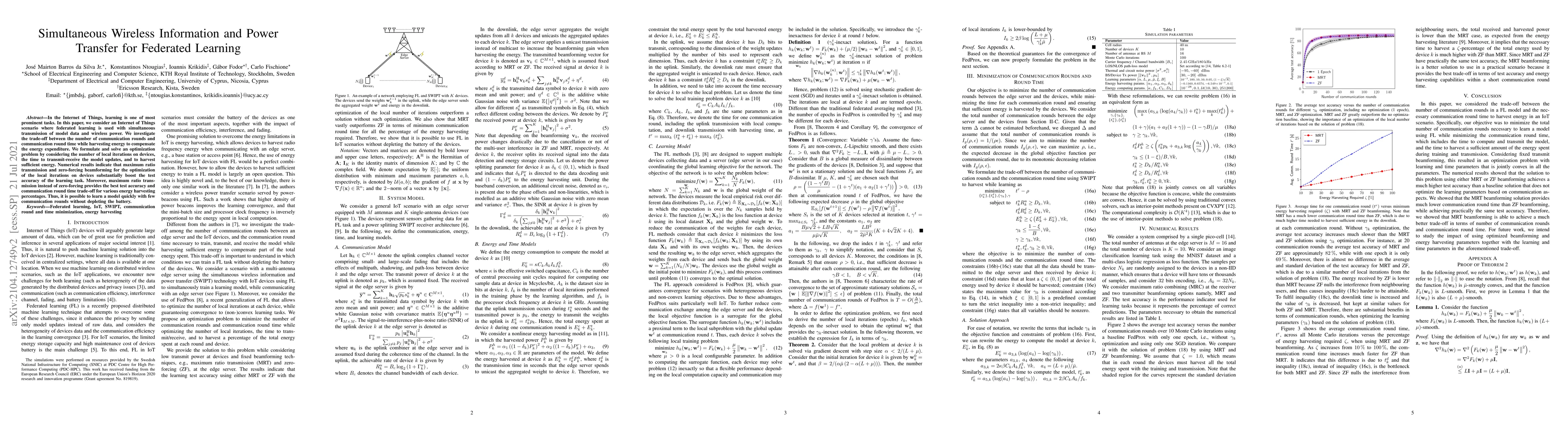 Researchers investigated simultaneous wireless information and power transfer for federated learning in IoT devices, finding that maximum ratio transmission boosts test accuracy and communication round time trade-off.