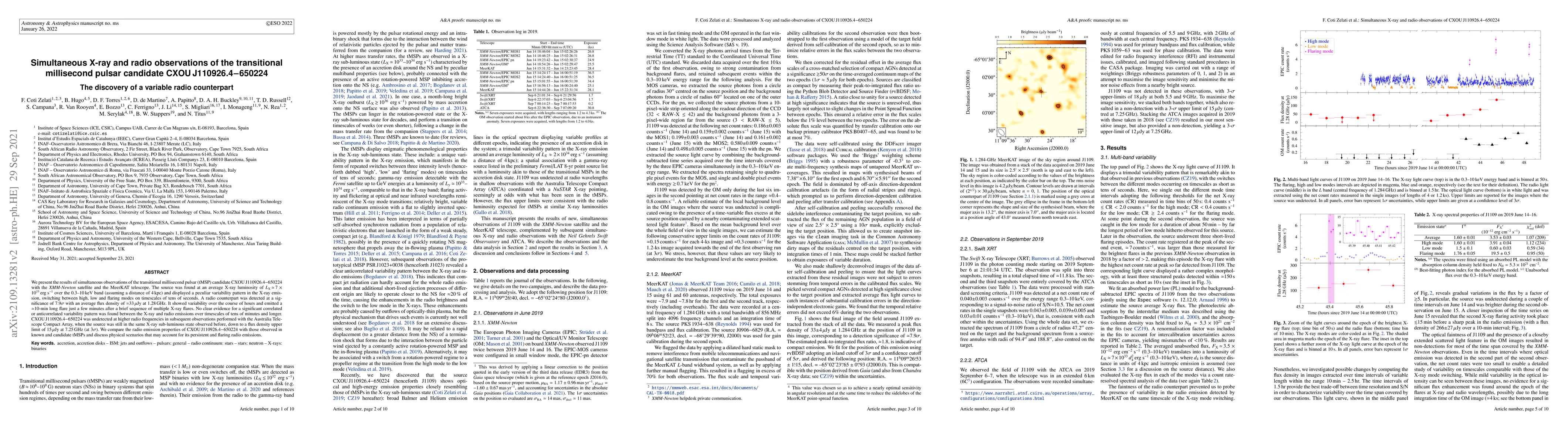 This paper reports simultaneous X-ray and radio observations of the transitional millisecond pulsar (tMSP) candidate CXOU J110926.4-650224, revealing variable radio emissions and a complex X-ray variability pattern, with no clear correlation between X-ray and radio emissions. The radio counterpart was detected at 1.28 GHz but not at higher frequencies, suggesting unique emission properties.