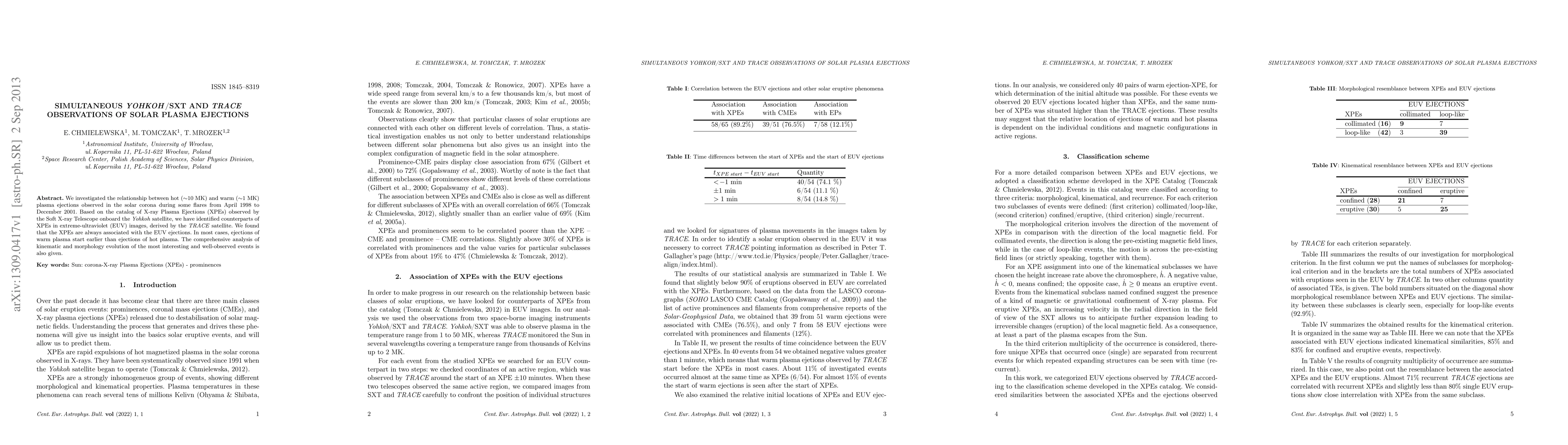 Researchers found that warm and hot solar plasma ejections are always paired together, with warm ejections starting earlier than hot ones, and that these events can be tracked using data from the Yohkoh and TRACE satellites.