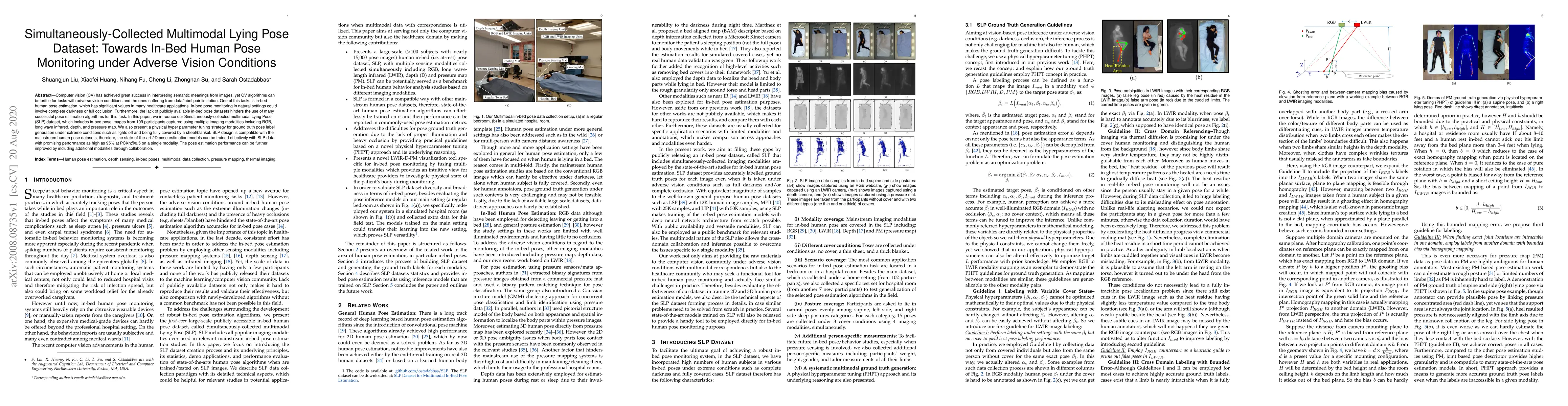 This paper introduces the Simultaneously-collected Multimodal Lying Pose (SLP) dataset, featuring in-bed human pose images from 109 participants captured under adverse vision conditions using RGB, infrared, depth, and pressure modalities. The dataset aims to enhance in-bed pose monitoring, crucial for healthcare applications, and is designed to facilitate the training of state-of-the-art 2D pose estimation models with promising results.