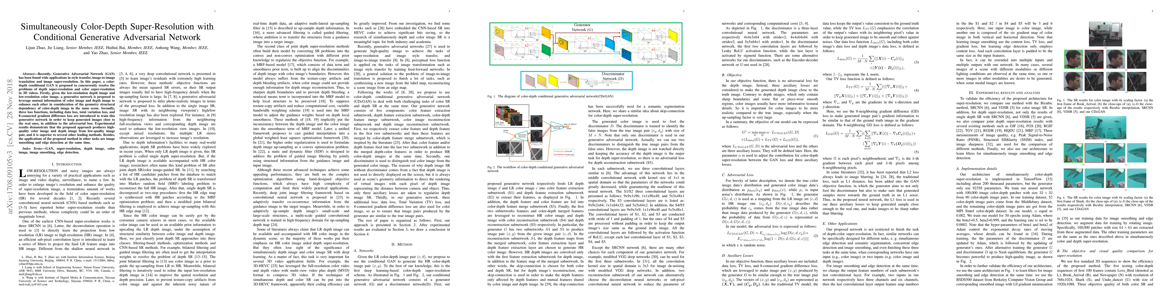 This paper proposes a color-depth conditional Generative Adversarial Network (GAN) to simultaneously enhance low-resolution color and depth images in 3D videos. The method leverages mutual information between color and depth images, employing three loss functions to improve generated image quality, and demonstrates superior performance over other methods.