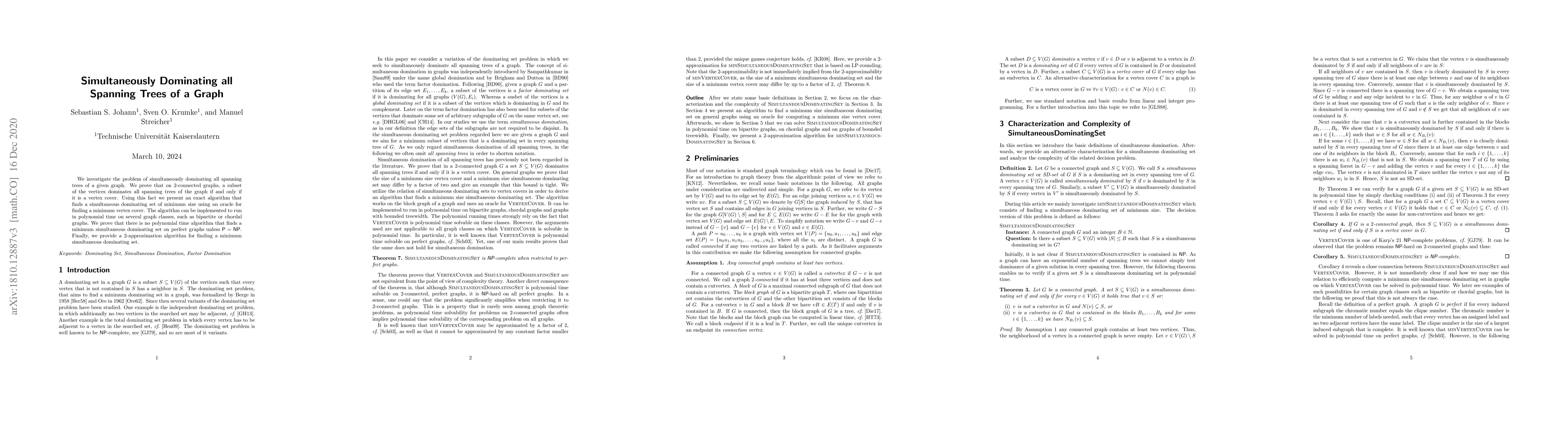 The paper investigates the problem of simultaneously dominating all spanning trees of a given graph, proving that on 2-connected graphs, a subset of vertices dominates all spanning trees if and only if it is a vertex cover. An exact algorithm is presented for finding a minimum simultaneous dominating set using an oracle for finding a minimum vertex cover, applicable in polynomial time for graph classes like bipartite or chordal graphs.