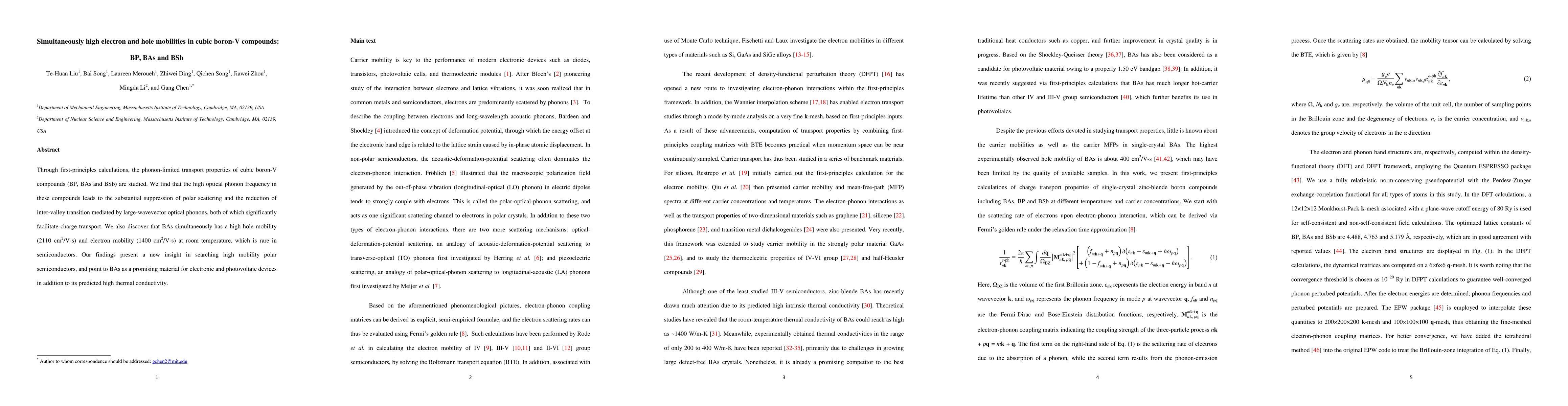This paper reports high electron and hole mobilities in cubic boron-V compounds BP, BAs, and BSb due to suppressed polar scattering and reduced inter-valley transitions. Notably, BAs exhibits exceptional room-temperature hole mobility of 2110 cm²/V-s and electron mobility of 1400 cm²/V-s, suggesting its potential for electronic and photovoltaic applications.