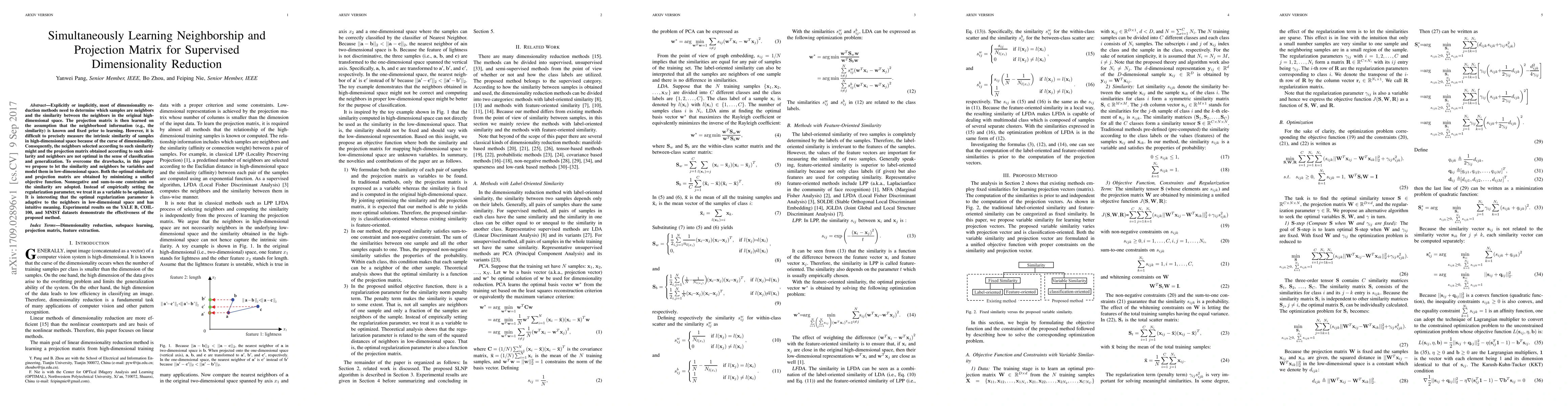 This paper proposes a method to simultaneously learn optimal similarity and projection matrix for supervised dimensionality reduction by modeling neighborship and projection in low-dimensional space, minimizing a unified objective function with constraints, and adaptively determining the regularization parameter. Experimental results show the method's effectiveness on YALE B, COIL-100, and MNIST datasets.