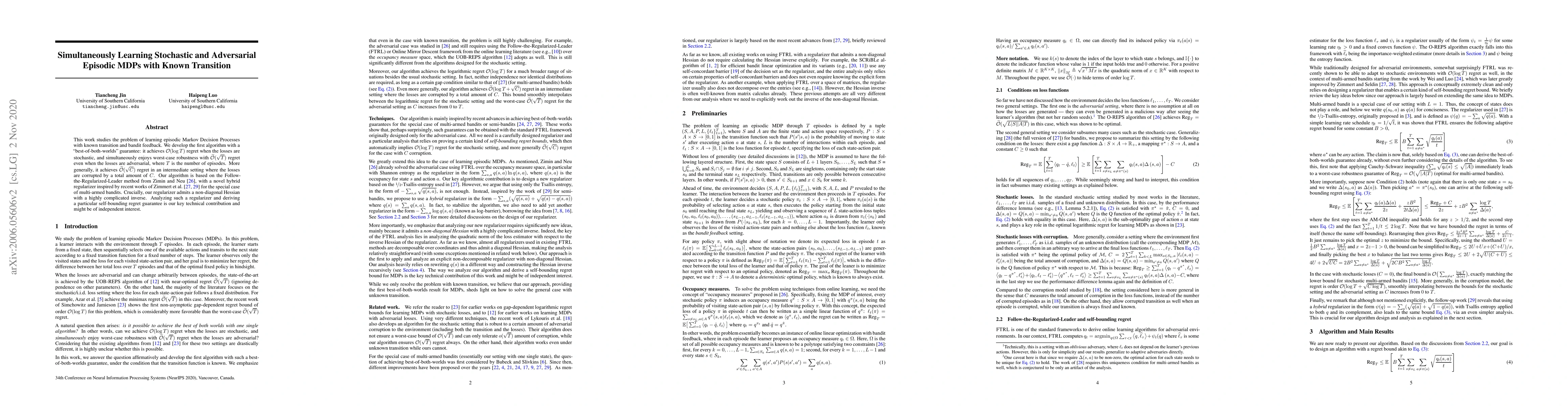 This research paper introduces a new algorithm that balances learning stochastic and adversarial episodic MDPs with known transitions while achieving optimal regret guarantees in both cases, and generalizes to an intermediate setting.