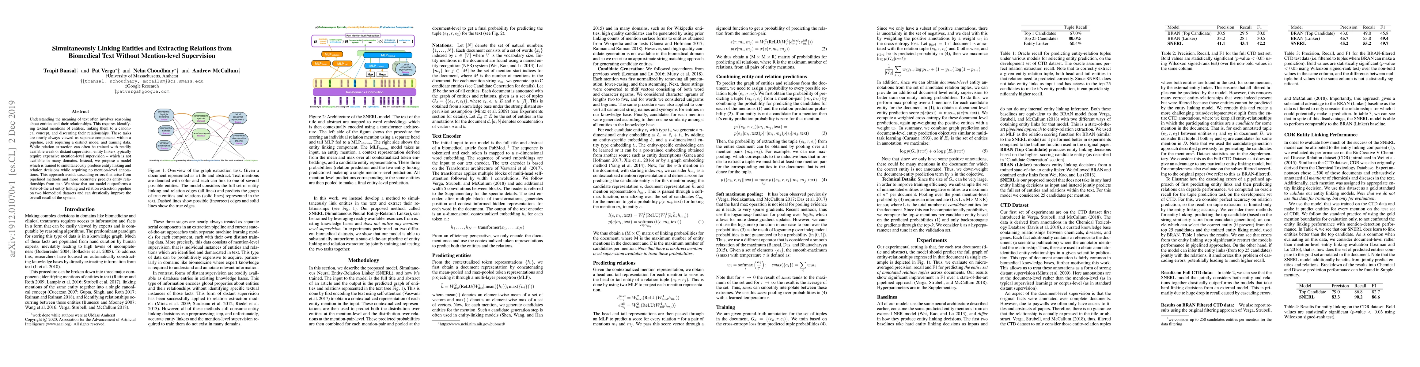 This paper proposes a model that simultaneously links entities and extracts relationships from biomedical text without needing mention-level supervision, addressing the limitations of traditional pipelined methods. The model outperforms existing approaches in predicting entity relationships, demonstrating improved recall and avoiding cascading errors.