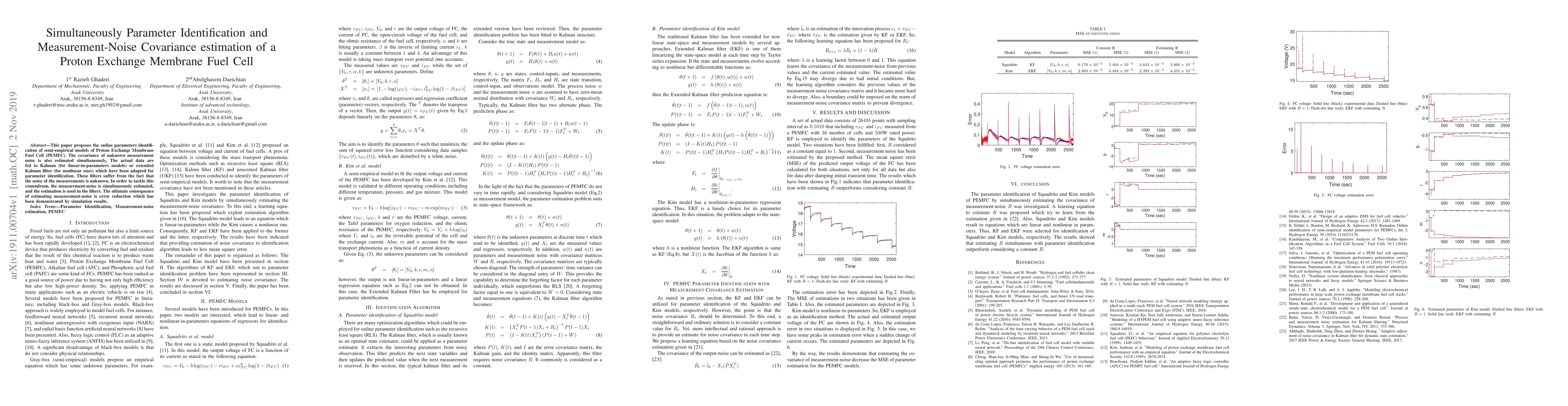 This paper proposes a new method to estimate parameters and measurement noise simultaneously in Proton Exchange Membrane Fuel Cells using Kalman filters, resulting in improved accuracy.