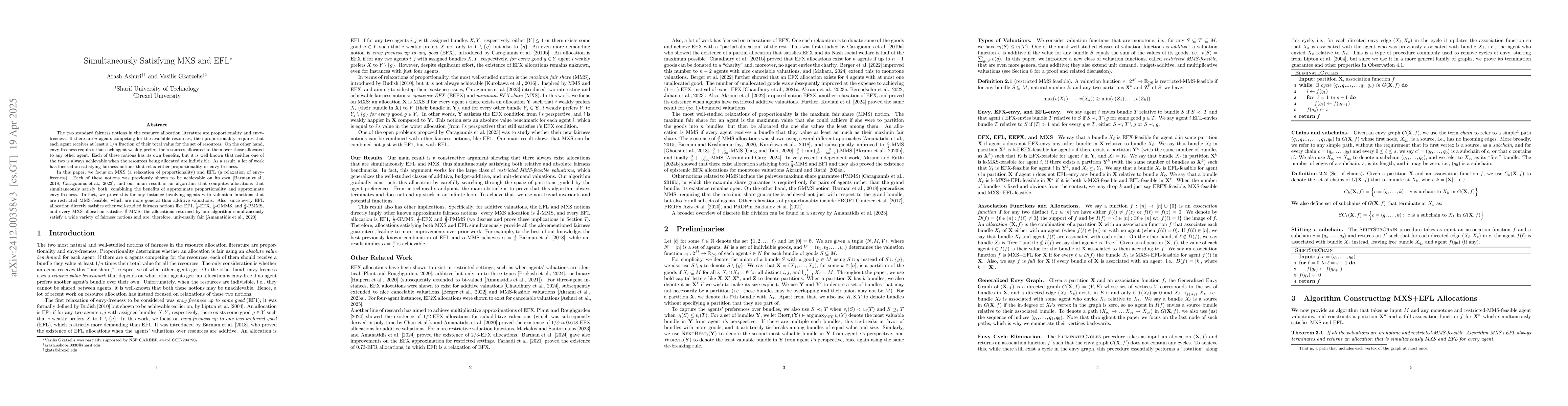 This paper presents an algorithm to achieve allocations that simultaneously satisfy MXS (a relaxation of proportionality) and EFL (a relaxation of envy-freeness) in indivisible resource allocation problems, thus combining the benefits of approximate proportionality and approximate envy-freeness. The algorithm is proven to work for agents with MMS-feasible valuation functions.