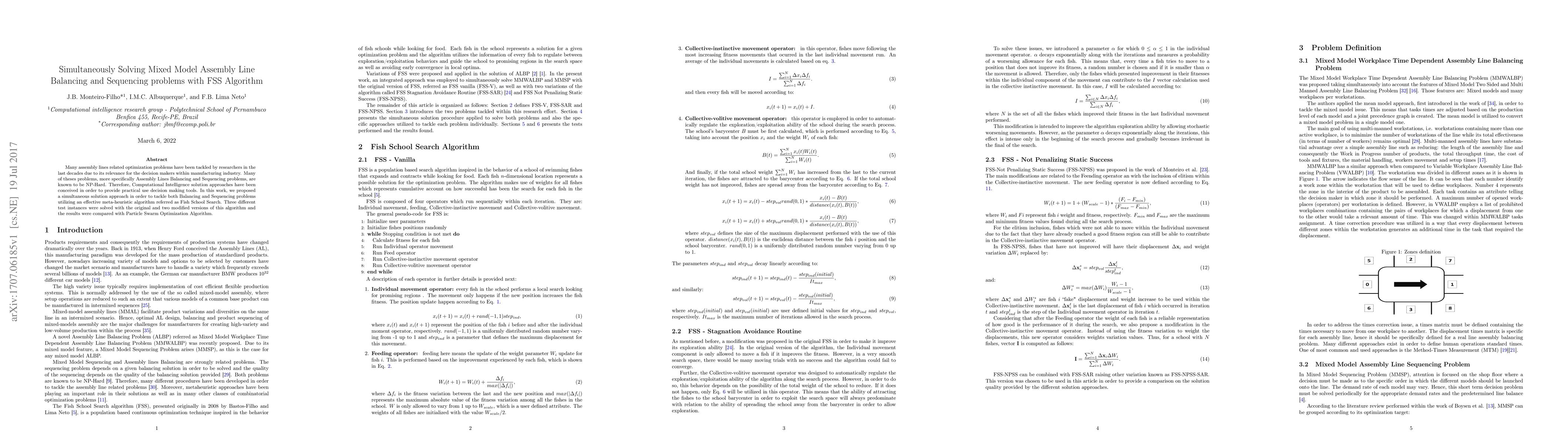 Many assembly lines related optimization problems have been tackled by researchers in the last decades due to its relevance for the decision makers within manufacturing industry. Many of theses problems, more specifically Assembly Lines Balancing and Sequencing problems, are known to be NP-Hard. Therefore, Computational Intelligence solution approaches have been conceived in order to provide practical use decision making tools. In this work, we proposed a simultaneous solution approach in order to tackle both Balancing and Sequencing problems utilizing an effective meta-heuristic algorithm referred as Fish School Search. Three different test instances were solved with the original and two modified versions of this algorithm and the results were compared with Particle Swarm Optimization Algorithm.