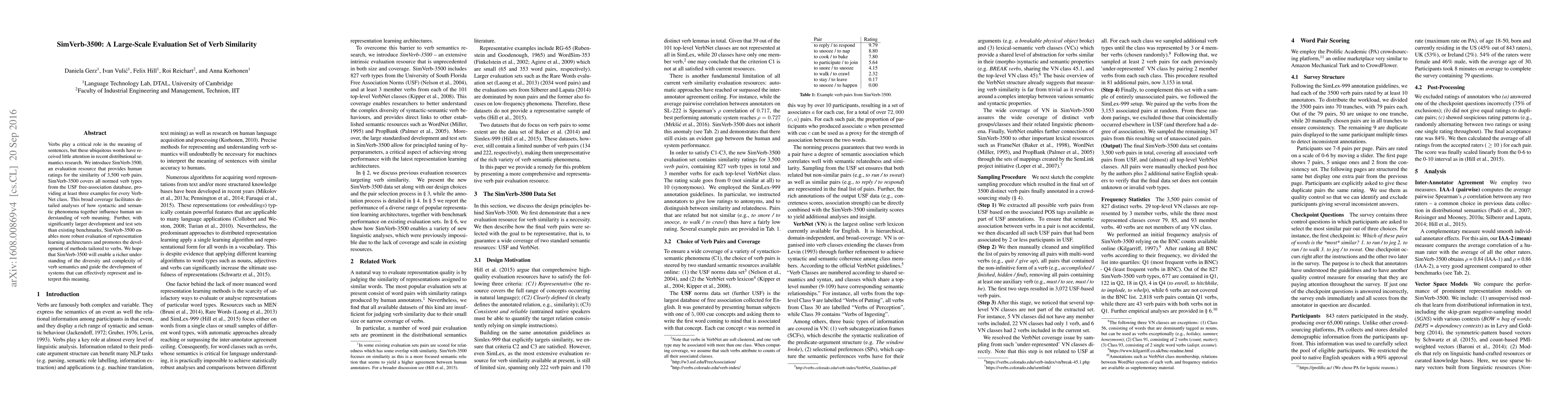 SimVerb-3500 is a new evaluation resource featuring human-rated verb similarity for 3,500 verb pairs, aiming to enhance distributional semantics research on verbs. It supports detailed analyses of verb meaning and promotes the development of advanced representation learning methods.
