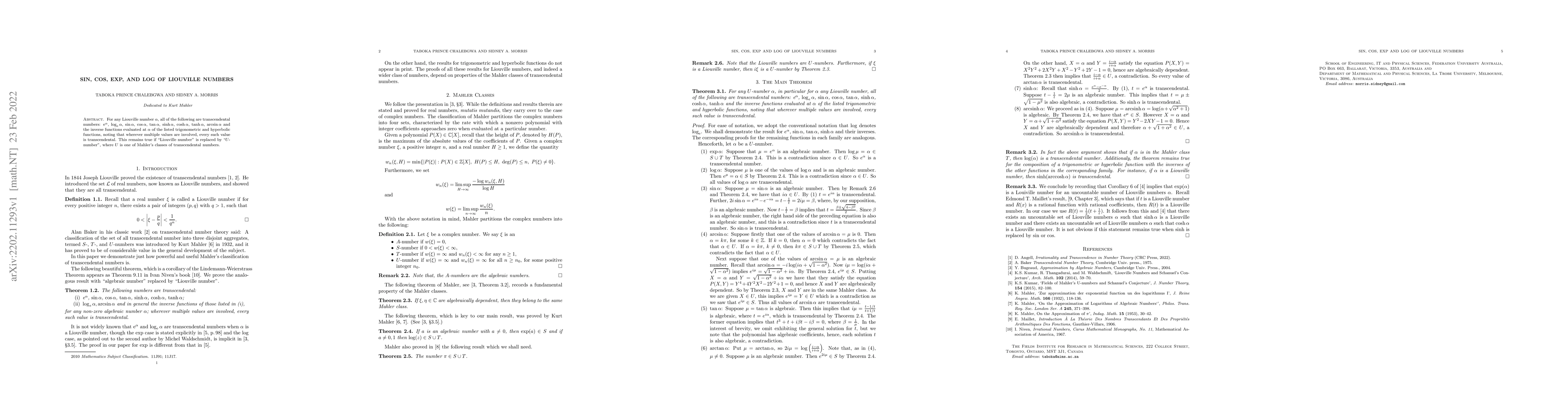This paper demonstrates that for any Liouville number $\alpha$, functions like $\sin \alpha$, $\cos \alpha$, and $\log_\textrm{e}\alpha$ are transcendental, as are their hyperbolic counterparts and inverse functions. This property extends to all Mahler's classes of transcendental numbers, not just Liouville numbers.