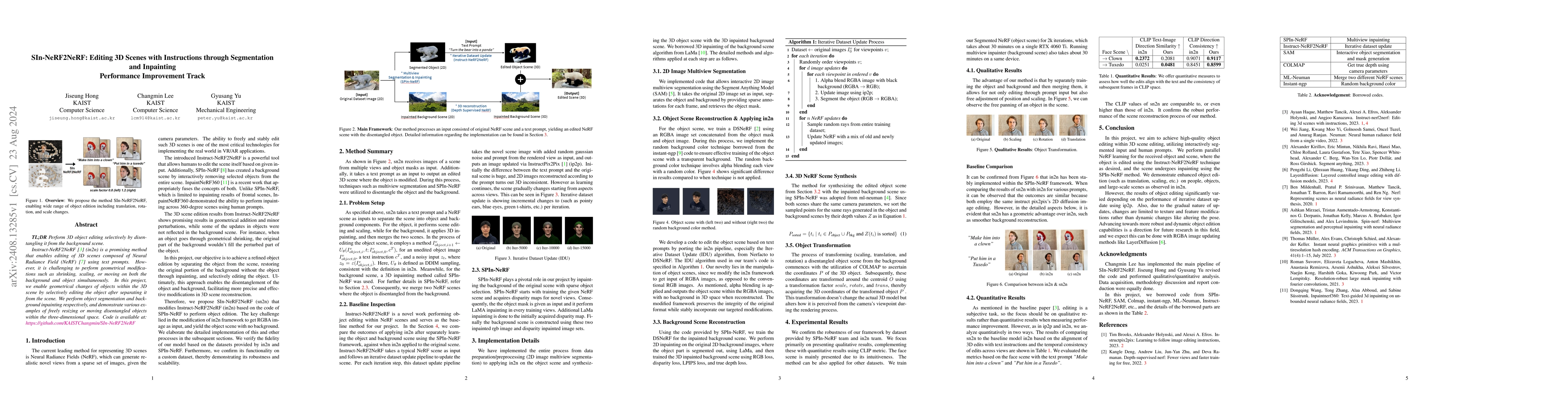 TL;DR Perform 3D object editing selectively by disentangling it from the background scene. Instruct-NeRF2NeRF (in2n) is a promising method that enables editing of 3D scenes composed of Neural Radiance Field (NeRF) using text prompts. However, it is challenging to perform geometrical modifications such as shrinking, scaling, or moving on both the background and object simultaneously. In this project, we enable geometrical changes of objects within the 3D scene by selectively editing the object after separating it from the scene. We perform object segmentation and background inpainting respectively, and demonstrate various examples of freely resizing or moving disentangled objects within the three-dimensional space.