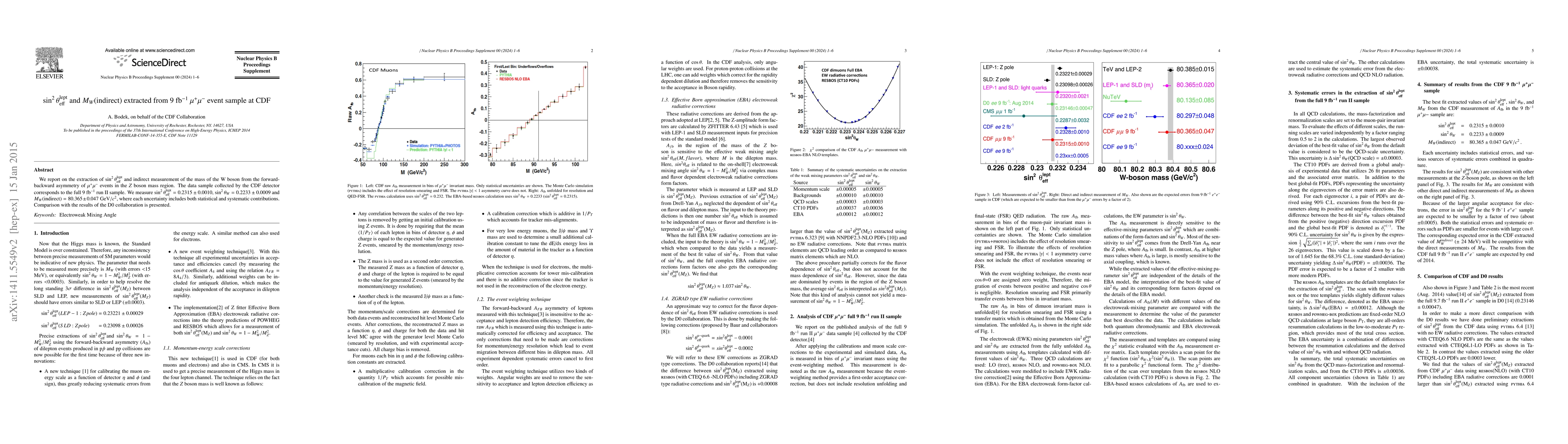 We report on the extraction of $\sin^2\theta^{\rm lept}_{\rm eff}$ and indirect measurement of the mass of the W boson from the forward-backward asymmetry of $\mu^+\mu^-$ events in the $Z$ boson mass region. The data sample collected by the CDF detector corresponds to the full 9 fb$^{-1}$ run II sample. We measure $\sin^2 \theta^{\rm lept}_{\rm eff} = 0.2315 \pm 0.0010$, $ \sin^2 \theta_W = 0.2233 \pm 0.0009$ and $M_W ({\rm indirect}) = 80.365 \pm 0.047 \;{\rm GeV}/c^2$, where each uncertainty includes both statistical and systematic contributions. Comparison with the results of the D0 collaboration are presented.