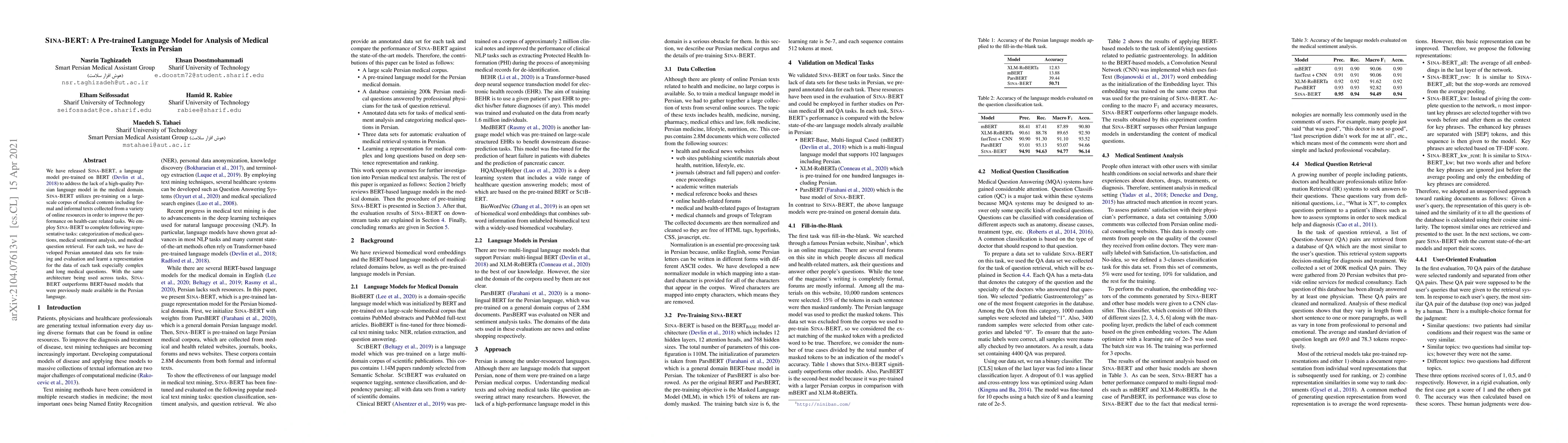We have released Sina-BERT, a language model pre-trained on BERT (Devlin et al., 2018) to address the lack of a high-quality Persian language model in the medical domain. SINA-BERT utilizes pre-training on a large-scale corpus of medical contents including formal and informal texts collected from a variety of online resources in order to improve the performance on health-care related tasks. We employ SINA-BERT to complete following representative tasks: categorization of medical questions, medical sentiment analysis, and medical question retrieval. For each task, we have developed Persian annotated data sets for training and evaluation and learnt a representation for the data of each task especially complex and long medical questions. With the same architecture being used across tasks, SINA-BERT outperforms BERT-based models that were previously made available in the Persian language.