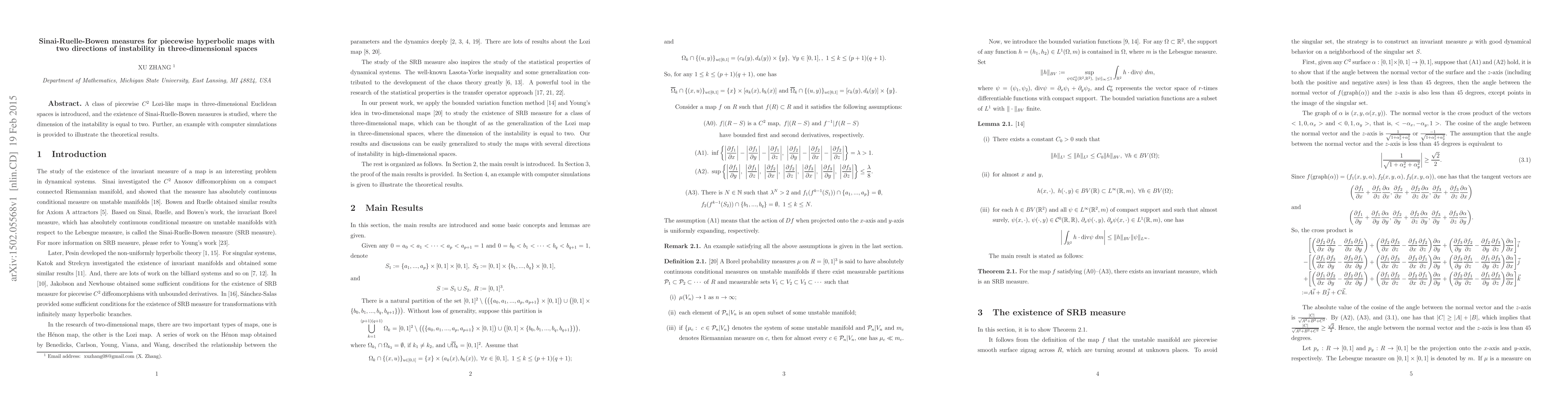 Summary: This paper explores Sinai-Ruelle-Bowen measures for a class of piecewise hyperbolic Lozi-like maps in three-dimensional spaces, demonstrating their existence when there are two directions of instability, and includes simulations to support the theoretical findings.