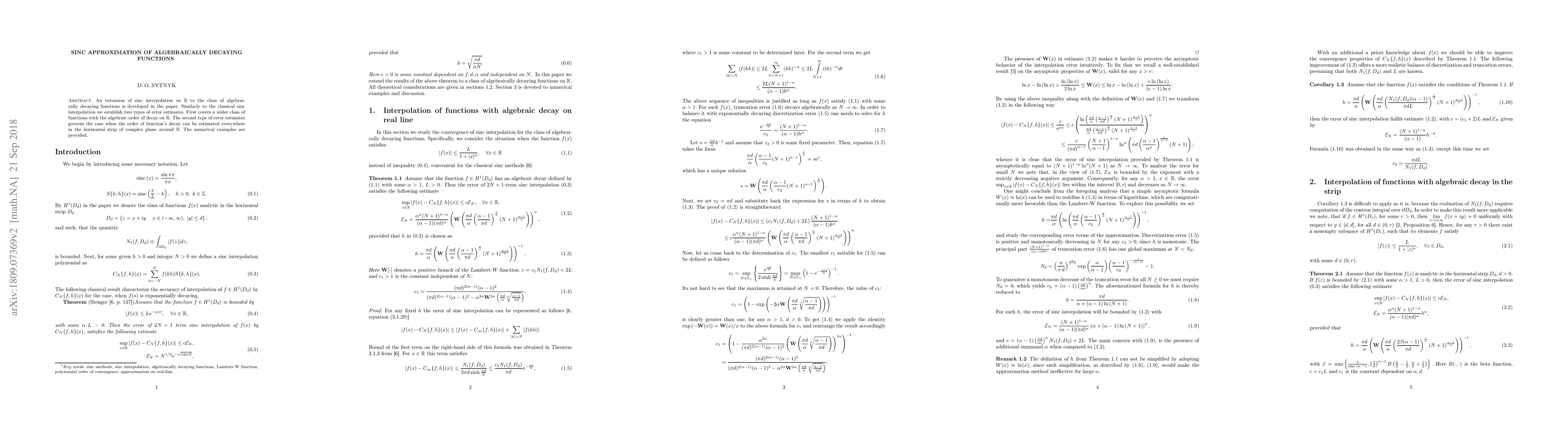 This paper extends sinc interpolation to algebraically decaying functions, establishing two types of error estimates: one for functions with algebraic decay on $\mathbb{R}$ and another for functions whose decay order can be estimated in a complex plane strip around $\mathbb{R}$. Numerical examples are provided to illustrate the method.