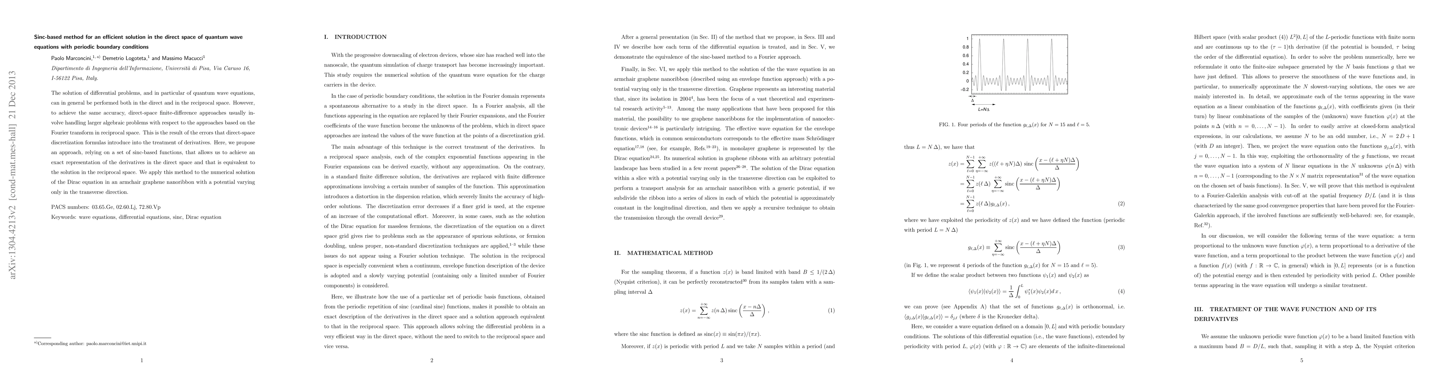 The solution of differential problems, and in particular of quantum wave equations, can in general be performed both in the direct and in the reciprocal space. However, to achieve the same accuracy, direct-space finite-difference approaches usually involve handling larger algebraic problems with respect to the approaches based on the Fourier transform in reciprocal space. This is the result of the errors that direct-space discretization formulas introduce into the treatment of derivatives. Here, we propose an approach, relying on a set of sinc-based functions, that allows us to achieve an exact representation of the derivatives in the direct space and that is equivalent to the solution in the reciprocal space. We apply this method to the numerical solution of the Dirac equation in an armchair graphene nanoribbon with a potential varying only in the transverse direction.