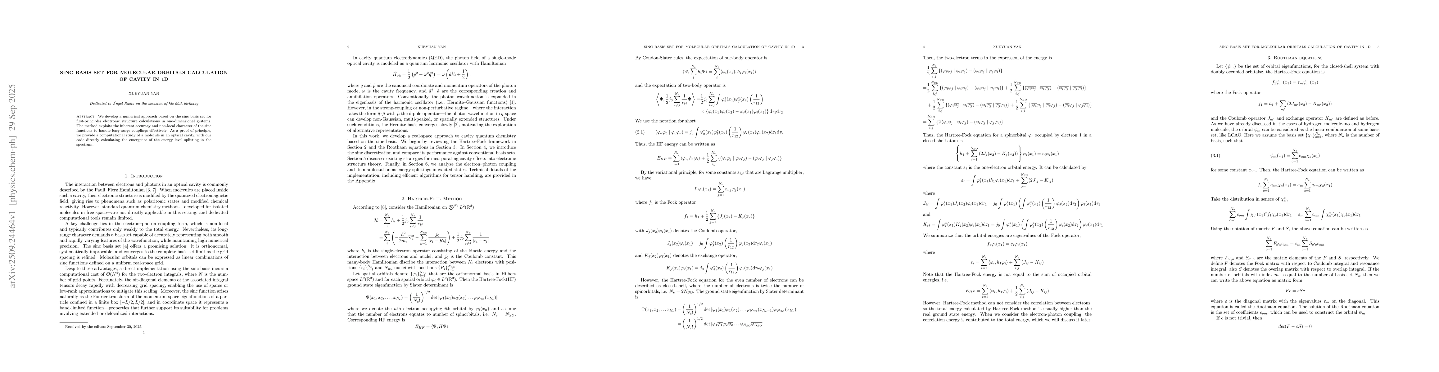 First implementation of cavity Hartree-Fock method using sinc basis functions with explicit treatment of dipole self-energy corrections, enabling efficient computation of electron-photon coupling effects in confined electromagnetic fields.
