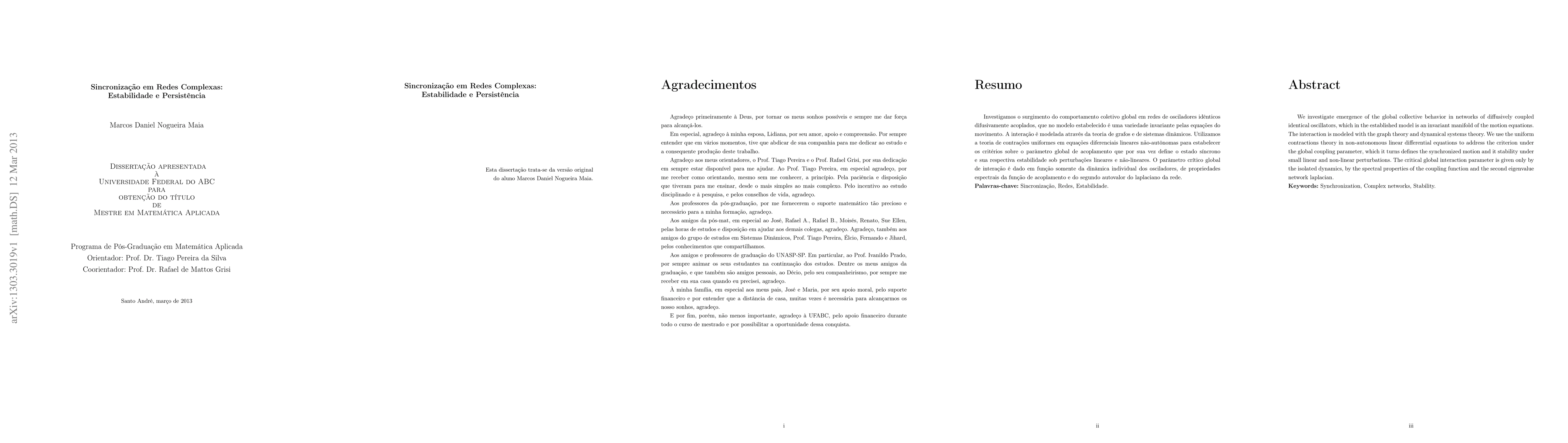 We investigate emergence of the global collective behavior in networks of diffusively coupled identical oscillators, which in the established model is an invariant manifold of the motion equations. The interaction is modeled with the graph theory and dynamical systems theory. We use the uniform contractions theory in non-autonomous linear differential equations to address the criterion under the global coupling parameter, which it turns defines the synchronized motion and it stability under small linear and non-linear perturbations. The critical global interaction parameter is given only by the isolated dynamics, by the spectral properties of the coupling function and the second eigenvalue network laplacian.