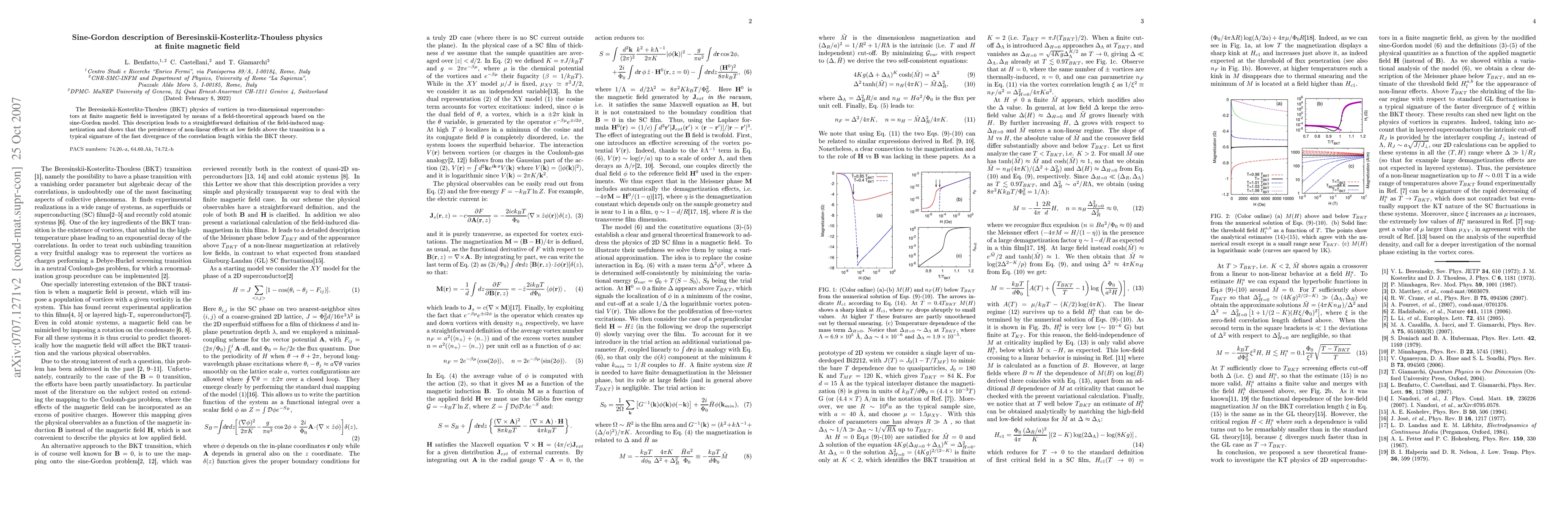 This paper uses the sine-Gordon model to describe BKT physics in two-dimensional superconductors under a finite magnetic field, providing a clear definition of field-induced magnetization and highlighting the non-linear effects' persistence as a sign of the correlation length's rapid divergence.