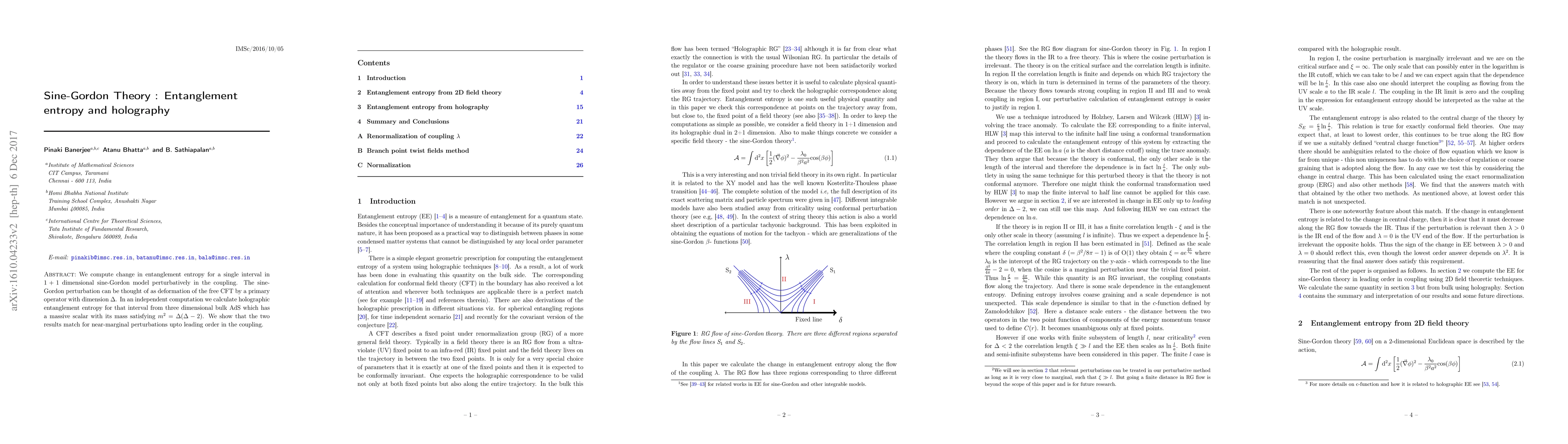 This paper computes entanglement entropy for a 1+1 dimensional sine-Gordon model and matches it with holographic entanglement entropy from a 3D AdS bulk, showing agreement up to leading order in the coupling.