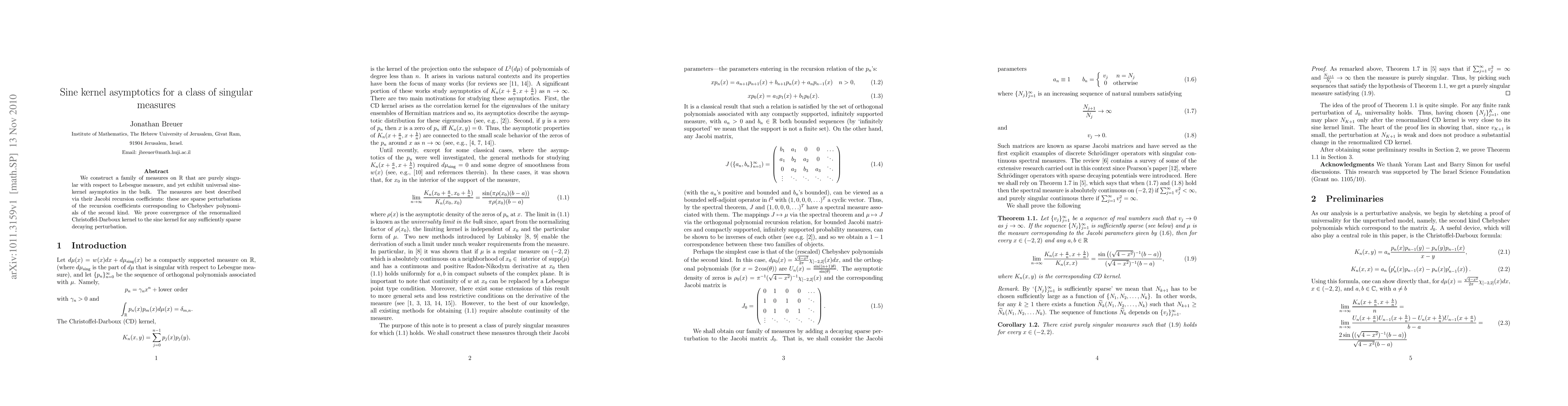 We construct a family of measures on $\bbR$ that are purely singular with respect to Lebesgue measure, and yet exhibit universal sine-kernel asymptotics in the bulk. The measures are best described via their Jacobi recursion coefficients: these are sparse perturbations of the recursion coefficients corresponding to Chebyshev polynomials of the second kind. We prove convergence of the renormalized Christoffel-Darboux kernel to the sine kernel for any sufficiently sparse decaying perturbation.