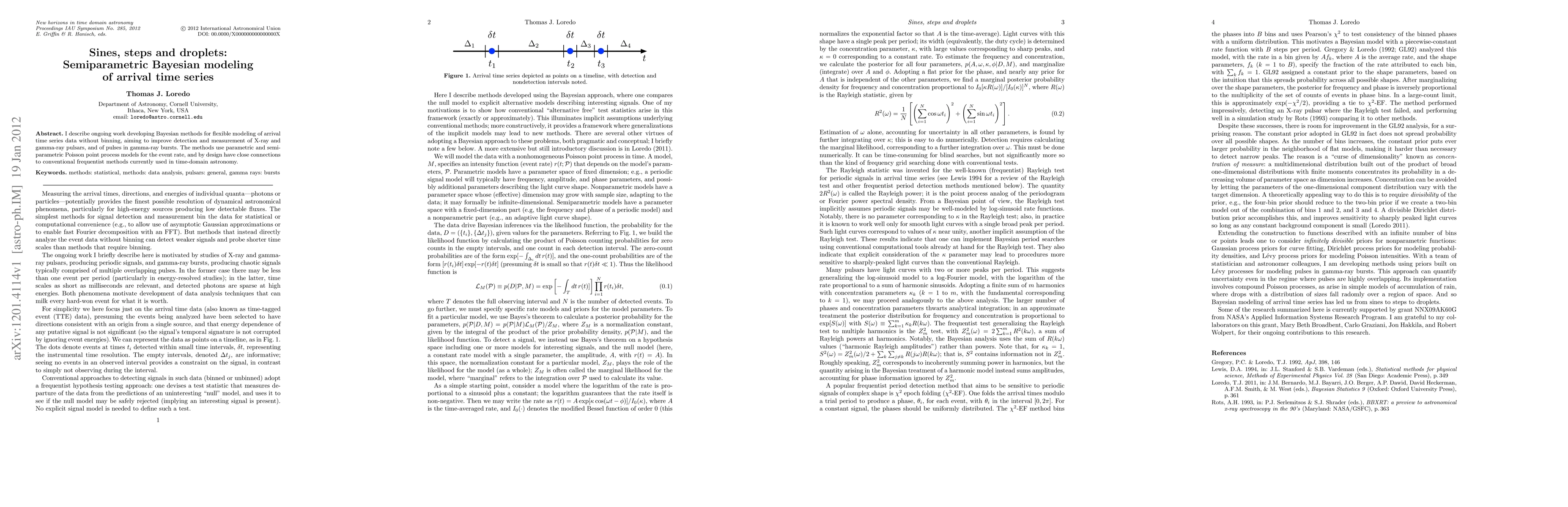 I describe ongoing work developing Bayesian methods for flexible modeling of arrival time series data without binning, aiming to improve detection and measurement of X-ray and gamma-ray pulsars, and of pulses in gamma-ray bursts. The methods use parametric and semiparametric Poisson point process models for the event rate, and by design have close connections to conventional frequentist methods currently used in time-domain astronomy.