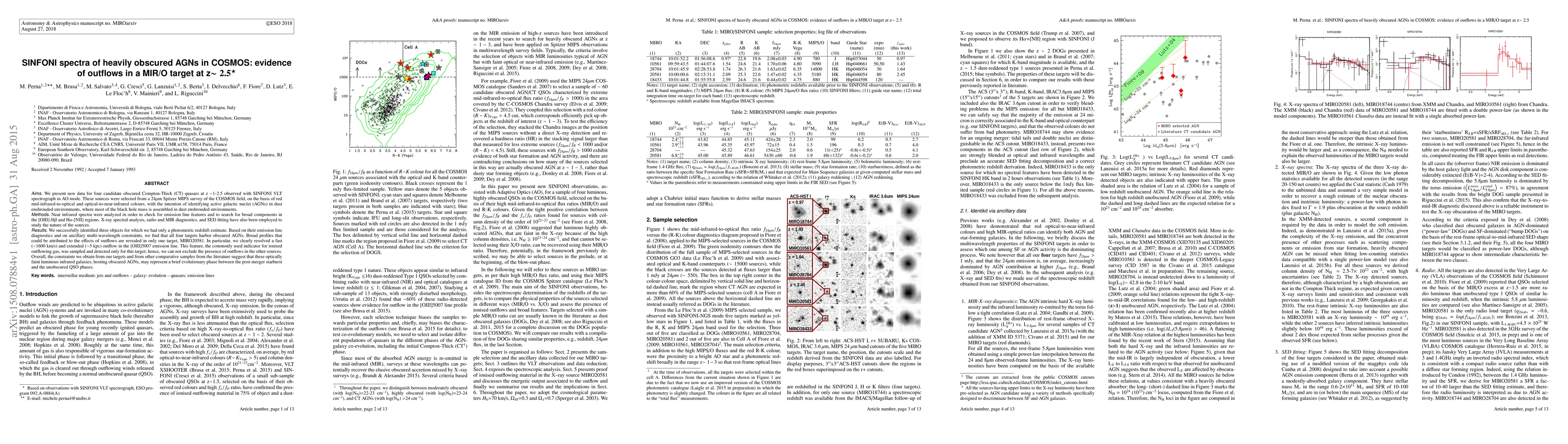 We present new data for four candidate obscured Compton-Thick (CT) quasars at z $\sim$1-2.5 observed with SINFONI VLT spectrograph in AO mode. These sources were selected from a 24$\mu$m Spitzer MIPS survey of the COSMOS field, on the basis of red mid-infrared-to-optical and optical-to-near-infrared colours, with the intention of identifying active galactic nuclei (AGNs) in dust enshrouded environments, where most of the black hole mass is assembled in dust enshrouded environments. Near infrared spectra were analyzed in order to check for emission line features and to search for broad components in the [OIII]-H$\beta$ and H$\alpha$-[NII] regions. X-ray spectral analysis, radio and MIR diagnostics, and SED fitting have also been employed to study the nature of the sources. We successfully identified three objects for which we had only a photometric redshift estimate. Based on their emission line diagnostics and on ancillary multi-wavelength constraints, we find that all four targets harbor obscured AGNs. Broad profiles that could be attributed to the effects of outflows are revealed in only one target, MIRO20581. In particular, we clearly resolved a fast ($\sim$1600 km/s) and extended ($\sim$5 kpc) outflow in the [OIII]5007 emission line. This feature, the commonly used indicator for ionised outflowing gas, was sampled and detected only for this target; hence, we can not exclude the presence of outflows in the other sources. Overall, the constraints we obtain from our targets and from other comparative samples from the literature suggest that these optically faint luminous infrared galaxies, hosting obscured AGNs, may represent a brief evolutionary phase between the post-merger starburst and the unobscured QSO phases.