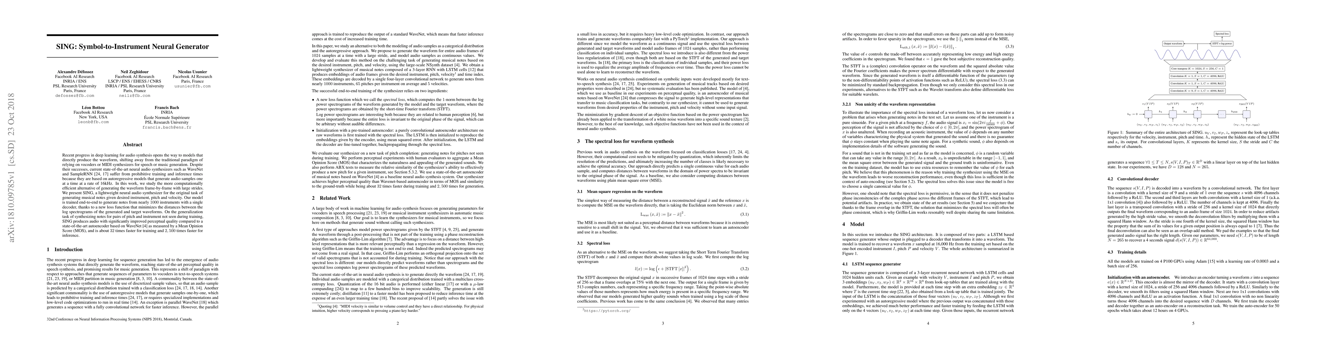 Recent progress in deep learning for audio synthesis opens the way to models that directly produce the waveform, shifting away from the traditional paradigm of relying on vocoders or MIDI synthesizers for speech or music generation. Despite their successes, current state-of-the-art neural audio synthesizers such as WaveNet and SampleRNN suffer from prohibitive training and inference times because they are based on autoregressive models that generate audio samples one at a time at a rate of 16kHz. In this work, we study the more computationally efficient alternative of generating the waveform frame-by-frame with large strides. We present SING, a lightweight neural audio synthesizer for the original task of generating musical notes given desired instrument, pitch and velocity. Our model is trained end-to-end to generate notes from nearly 1000 instruments with a single decoder, thanks to a new loss function that minimizes the distances between the log spectrograms of the generated and target waveforms. On the generalization task of synthesizing notes for pairs of pitch and instrument not seen during training, SING produces audio with significantly improved perceptual quality compared to a state-of-the-art autoencoder based on WaveNet as measured by a Mean Opinion Score (MOS), and is about 32 times faster for training and 2, 500 times faster for inference.