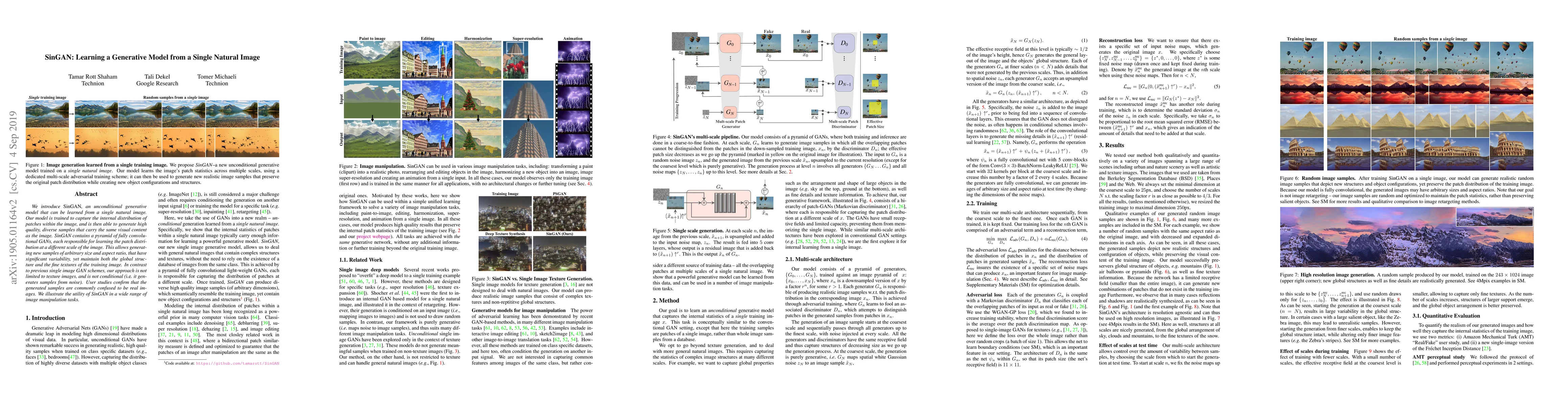 We introduce SinGAN, an unconditional generative model that can be learned from a single natural image. Our model is trained to capture the internal distribution of patches within the image, and is then able to generate high quality, diverse samples that carry the same visual content as the image. SinGAN contains a pyramid of fully convolutional GANs, each responsible for learning the patch distribution at a different scale of the image. This allows generating new samples of arbitrary size and aspect ratio, that have significant variability, yet maintain both the global structure and the fine textures of the training image. In contrast to previous single image GAN schemes, our approach is not limited to texture images, and is not conditional (i.e. it generates samples from noise). User studies confirm that the generated samples are commonly confused to be real images. We illustrate the utility of SinGAN in a wide range of image manipulation tasks.