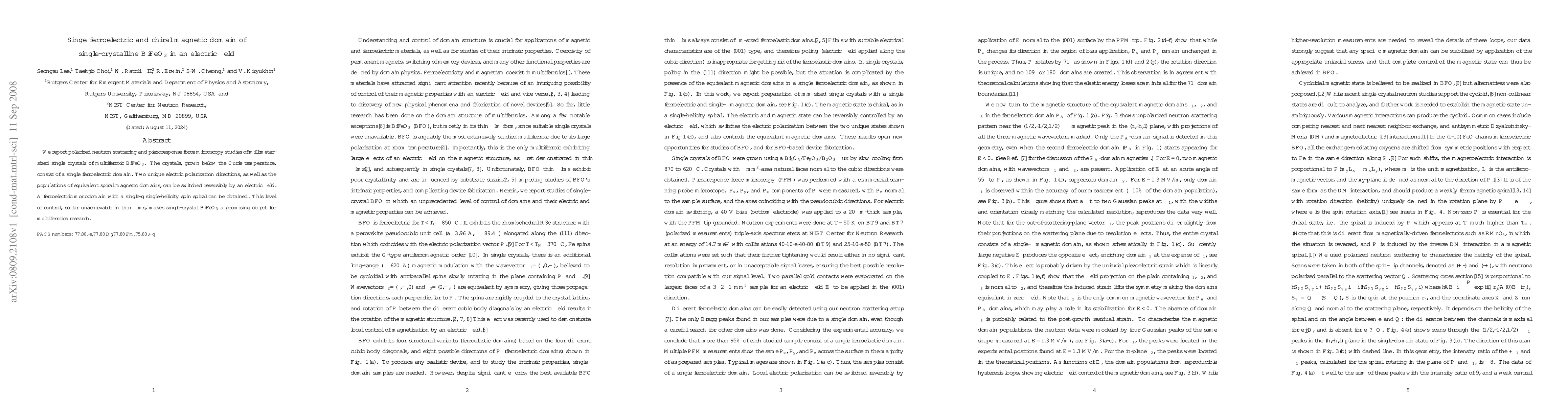 This study reveals that single-crystalline BiFeO$_3$ exhibits a single ferroelectric domain controllable by an electric field, with reversible switching of its unique polarization and magnetic spiral domains, presenting potential advancements for multiferroics research. The ability to achieve such control in millimeter-sized crystals contrasts with limitations in thin films.
