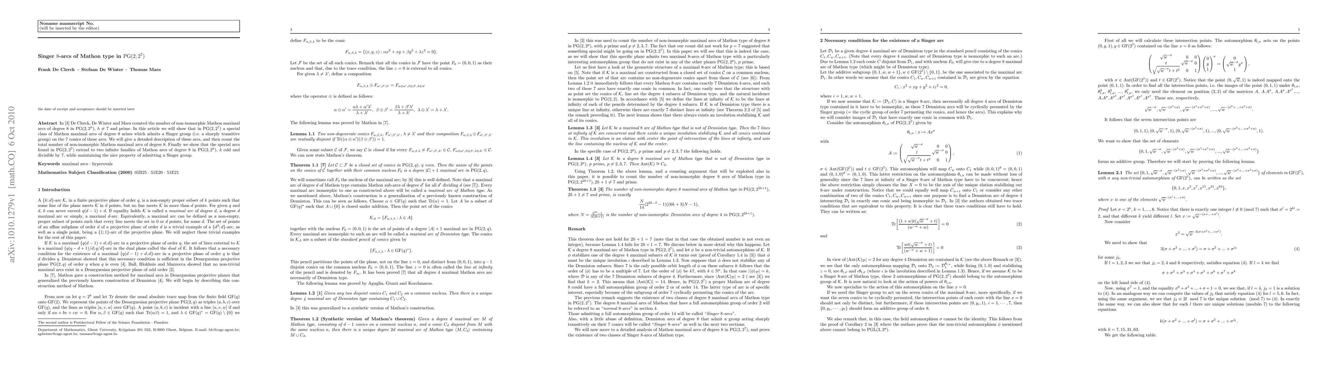 This paper investigates Mathon maximal arcs of degree 8 in PG(2,2^7), discovering a special class that is governed by a Singer group on conics, and counts the total number of such arcs. It also extends these arcs to two infinite families in PG(2,2^k) for k odd and divisible by 7, maintaining the Singer group property.