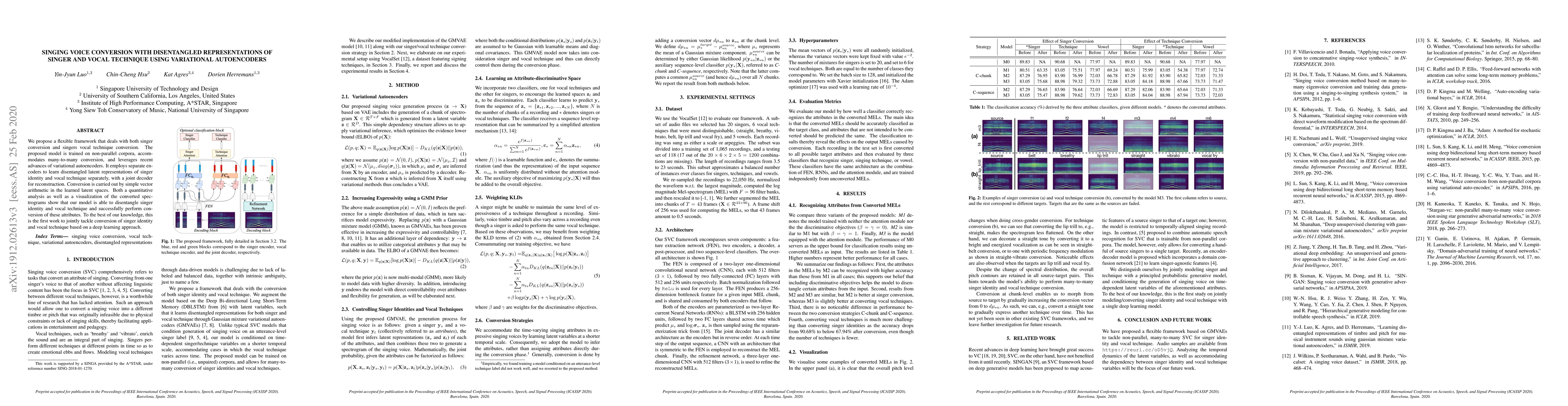 This paper introduces a novel framework for singing voice conversion using variational autoencoders, which disentangles singer identity and vocal technique. The model achieves many-to-many conversion and demonstrates successful conversion through quantitative analysis and spectrogram visualization.