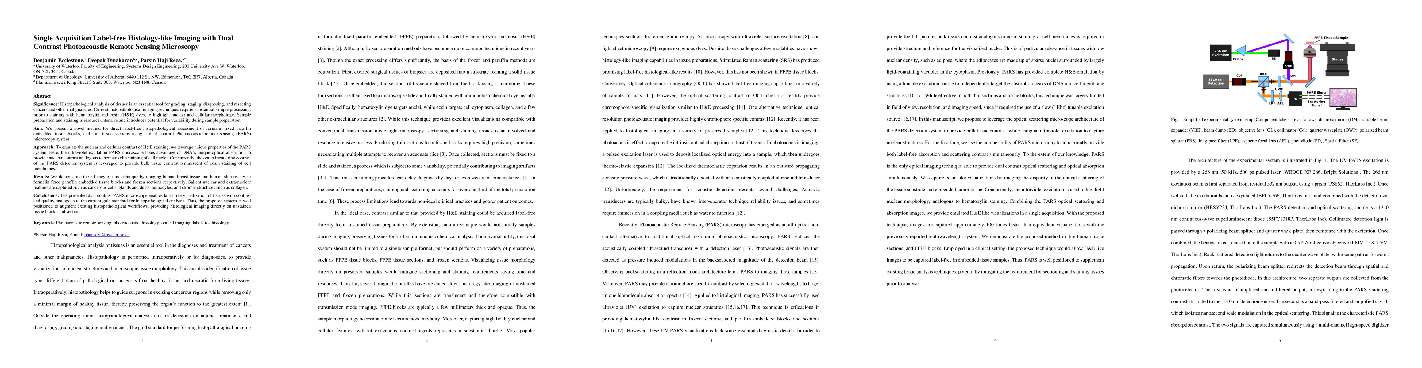 Significance: Histopathological analysis of tissues is an essential tool for grading, staging, diagnosing and resecting cancers and other malignancies. Current histopathological techniques require substantial sample processing prior to staining with hematoxylin and eosin (H&E) dyes, to highlight nuclear and cellular morphology. Sample preparation and staining is resource-intensive and introduces potential for variability during sample preparation. Aim: We present a novel method for direct label-free histopathological assessment of formalin fixed paraffin embedded tissue blocks and thin tissue sections using a dual contrast photoacoustic remote sensing (PARS) microscopy system. Approach: To emulate the nuclear and cellular contrast of H&E staining, we leverage unique properties of the PARS system. Here the ultraviolet excitation of the PAARS microscope takes advantage of DNA's unique optical absorption to provide nuclear contrast analogous to hematoxylin staining of cell nucelli. Concurrently, the optical scattering contrast of the PARS detection system is leveraged to provide bulk tissue contrast analogous to eosin staining of cell membranes. Results: We demonstrate the efficacy of this technique by imaging human breast tissue and human skin tissues in formalin fixed paraffin embedded tissue blocks and frozen sections respectively. Salient nuclear and extra-nuclear features such as cancerous cells, glands and ducts, adipocytes, and stromal structures such as collagen. Conclusions. The presented dual contrast PARS microscope enables label-free visualizations of tissue with contrast and quality analogous to the current gold standard for histopathological analysis. Thus, the proposed system is well positioned to augment existing histopathological workflows, providing histological imaging directly on unstained tissue blocks and sections.