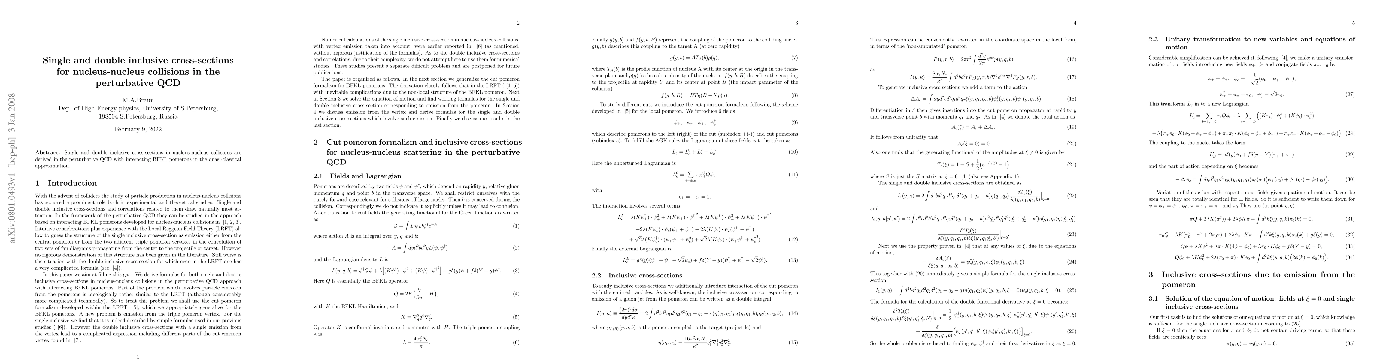 Single and double inclusive cross-sections in nucleus-nucleus collisions are derived in the perturbative QCD with interacting BFKL pomerons in the quasi-classical approximation.