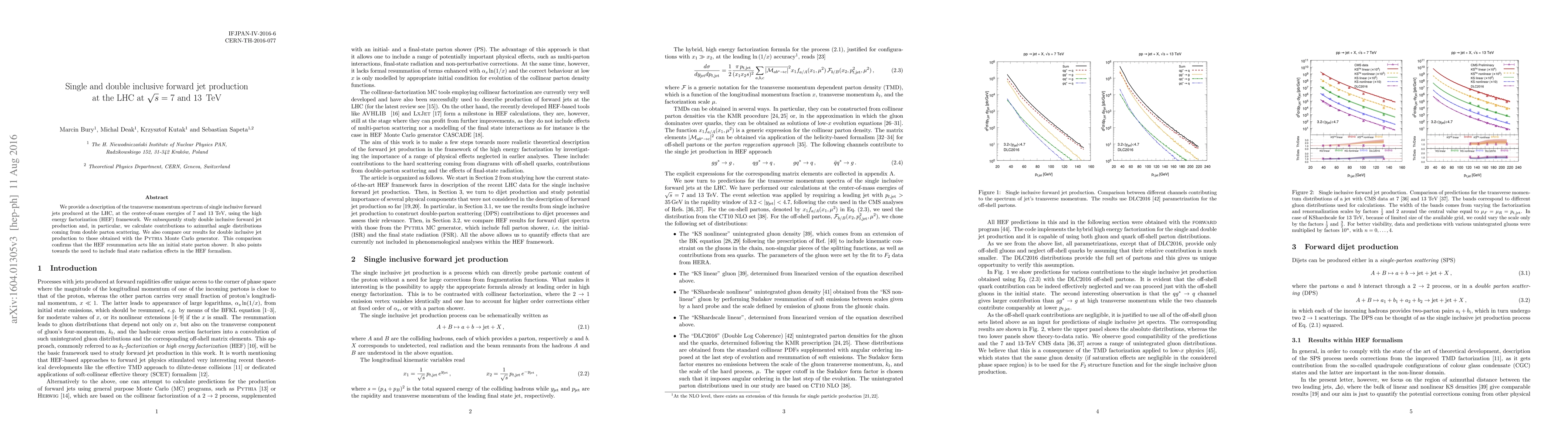 This paper investigates the transverse momentum spectrum of single and double inclusive forward jets at the LHC for energies of 7 and 13 TeV using the high energy factorization framework. It highlights the role of double parton scattering in azimuthal angle distributions and compares results with the Pythia Monte Carlo generator, indicating the necessity of incorporating final state radiation effects in the HEF formalism.