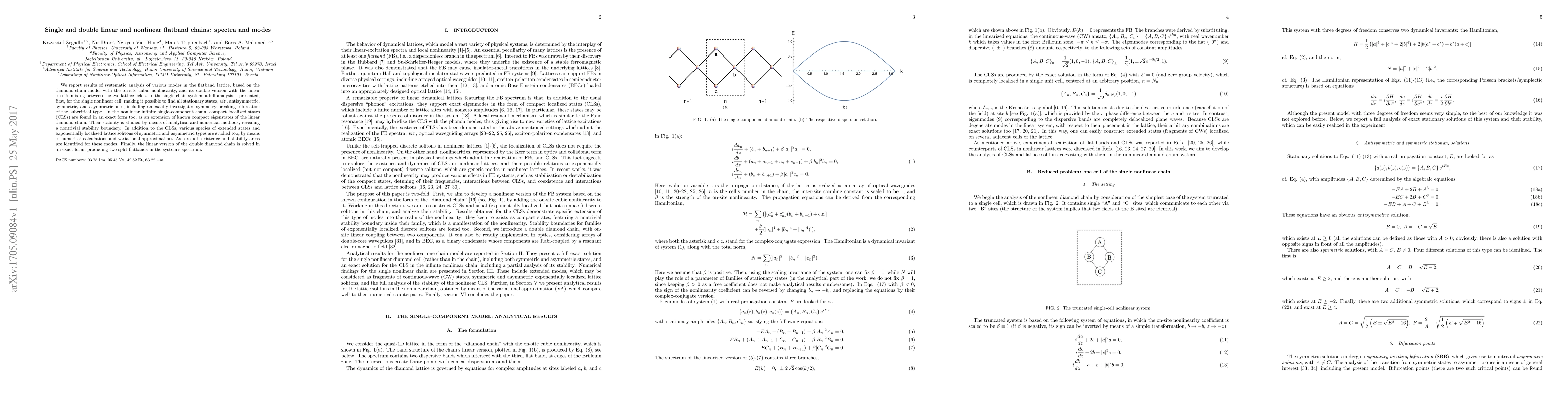 We report results of systematic analysis of various modes in the flatband lattice, based on the diamond-chain model with the on-site cubic nonlinearity, and its double version with the linear on-site mixing between the two lattice fields. In the single-chain system, a full analysis is presented, first, for the single nonlinear cell, making it possible to find all stationary states, viz., antisymmetric, symmetric, and asymmetric ones, including an exactly investigated symmetry-breaking bifurcation of the subcritical type. In the nonlinear infinite single-component chain, compact localized states (CLSs) are found in an exact form too, as an extension of known compact eigenstates of the linear diamond chain. Their stability is studied by means of analytical and numerical methods, revealing a nontrivial stability boundary. In addition to the CLSs, various species of extended states and exponentially localized lattice solitons of symmetric and asymmetric types are studied too, by means of numerical calculations and variational approximation. As a result, existence and stability areas are identified for these modes. Finally, the linear version of the double diamond chain is solved in an exact form, producing two split flatbands in the system's spectrum.
