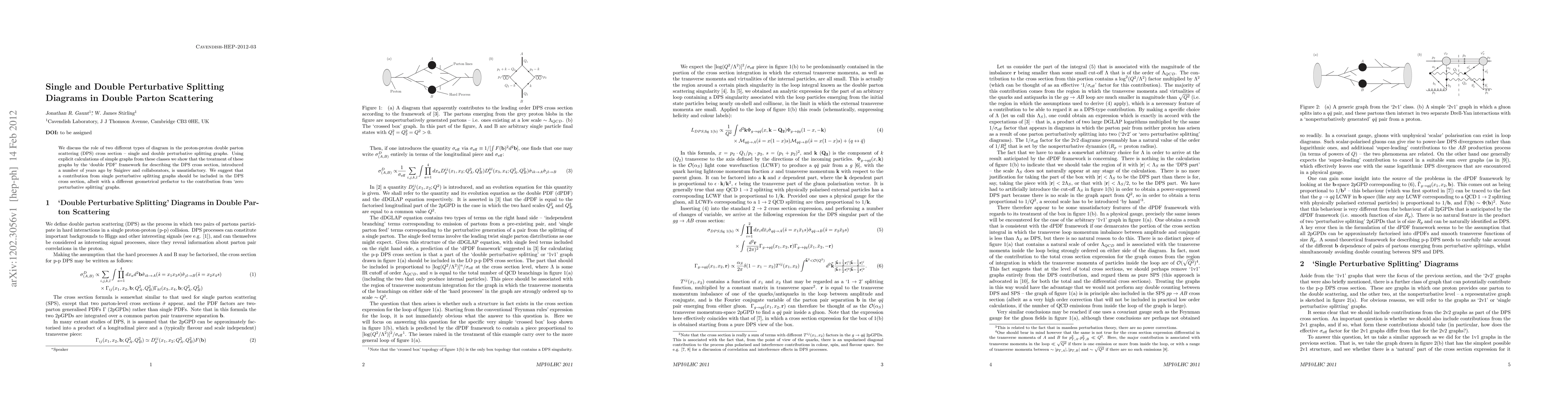 We discuss the role of two different types of diagram in the proton-proton double parton scattering (DPS) cross section - single and double perturbative splitting graphs. Using explicit calculations of simple graphs from these classes we show that the treatment of these graphs by the 'double PDF' framework for describing the DPS cross section, introduced a number of years ago by Snigirev and collaborators, is unsatisfactory. We suggest that a contribution from single perturbative splitting graphs should be included in the DPS cross section, albeit with a different geometrical prefactor to the contribution from 'zero perturbative splitting' graphs.
