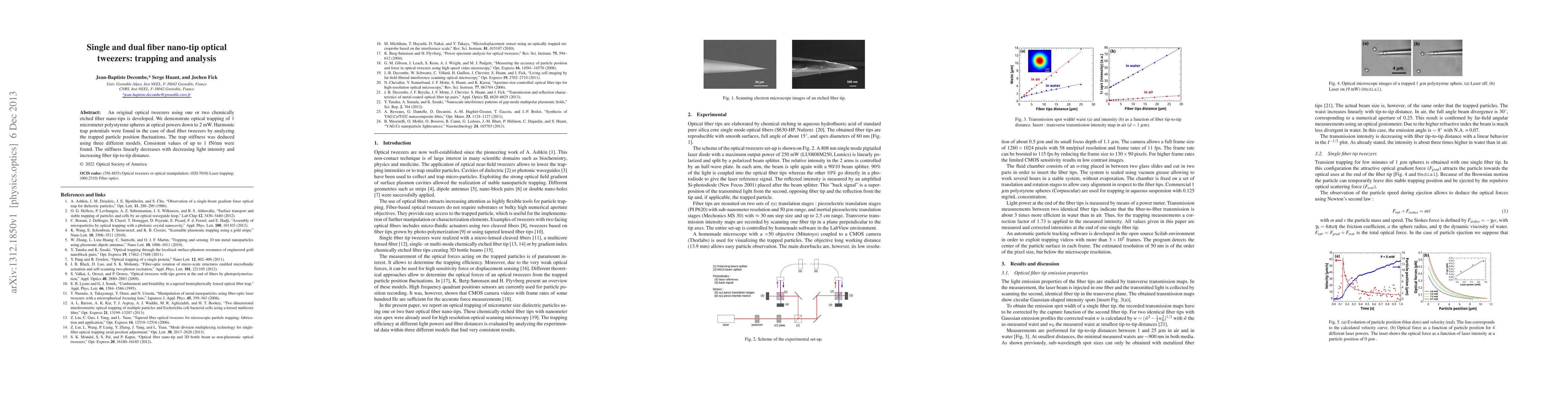 The research develops an original optical tweezers using one or two chemically etched fiber nano-tips, demonstrating trapping of 1 micrometer polystyrene spheres at optical powers as low as 2 mW.