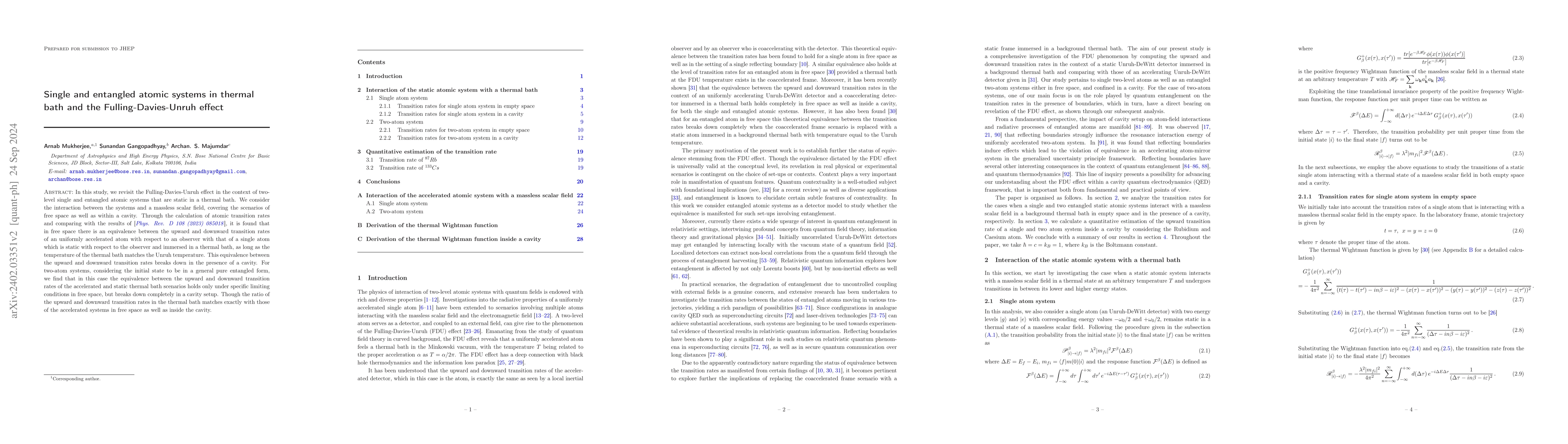 This paper examines the Fulling-Davies-Unruh effect on single and entangled atomic systems in thermal baths, comparing uniformly accelerated atoms to static ones in free space and cavities. It reveals that equivalence between these scenarios holds in free space at matching temperatures but breaks down in cavities, especially for entangled systems.
