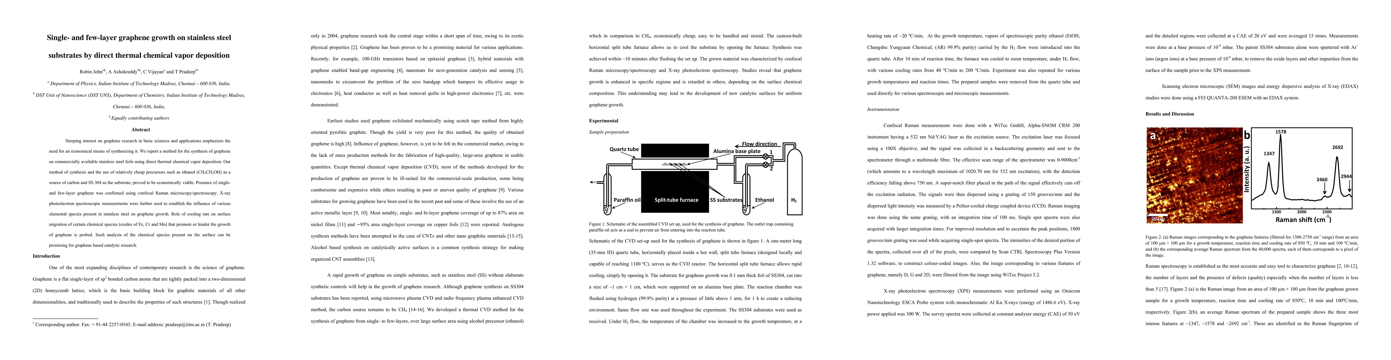 The paper demonstrates a simple and cost-effective thermal CVD method for synthesizing single- and few-layer graphene on stainless steel substrates, with a focus on understanding the role of growth parameters and surface species on graphene formation.