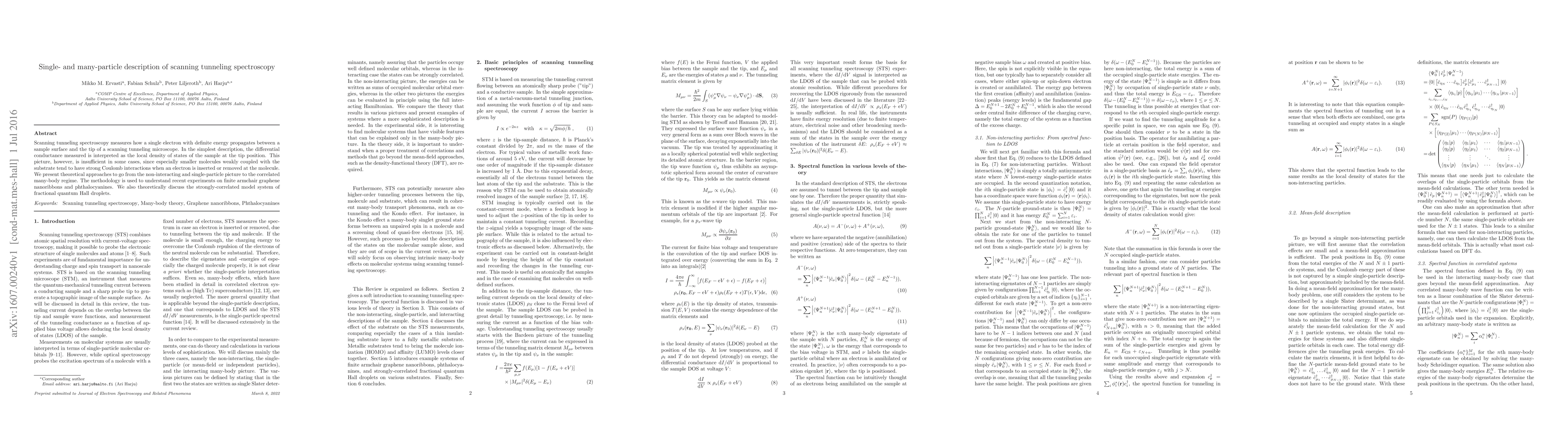This paper explores the transition from single-particle to many-body descriptions in scanning tunneling spectroscopy to better interpret measurements on weakly coupled molecules. It applies these theoretical approaches to analyze experiments on graphene nanoribbons and phthalocyanines, and discusses the implications for strongly-correlated systems like fractional quantum Hall droplets.