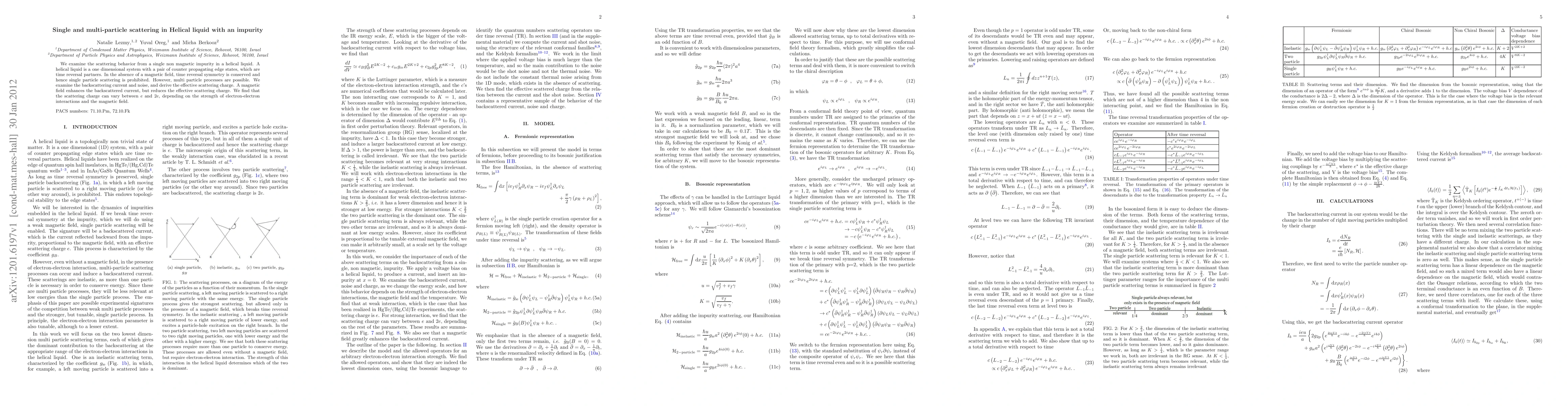 This paper investigates scattering phenomena in a helical liquid with an impurity, revealing that while single-particle scattering is forbidden due to time reversal symmetry, multi-particle processes are possible. The study finds that a magnetic field enhances backscattering current but reduces the effective scattering charge, which can vary between $e$ and $2e$ based on electron-electron interactions and magnetic field strength.