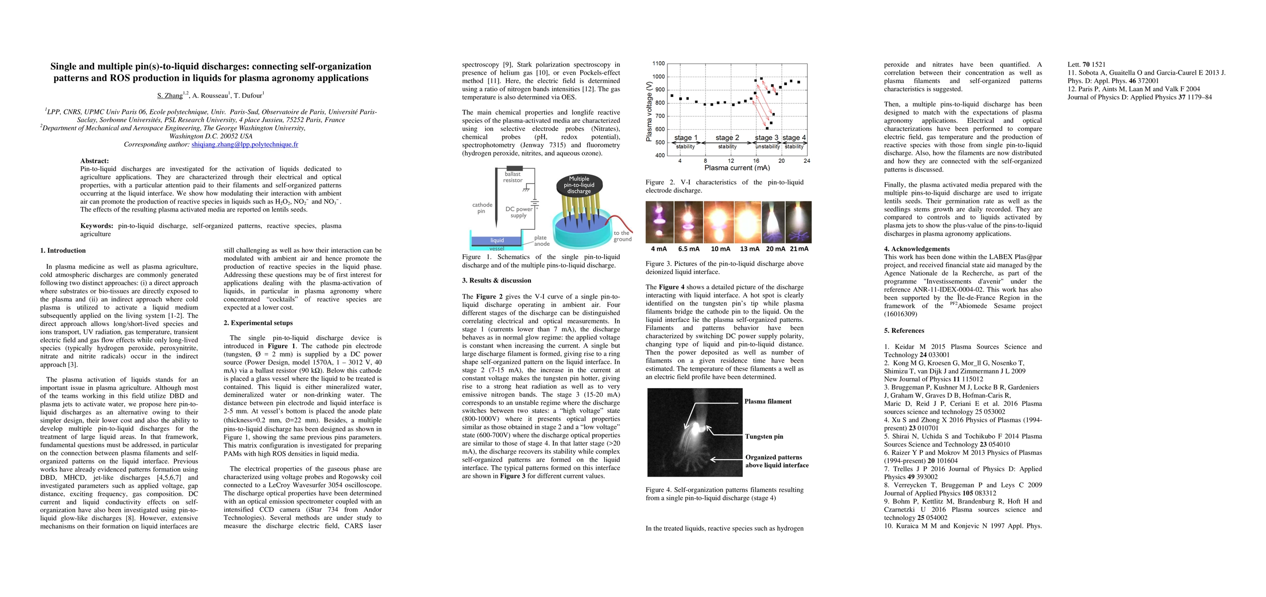 This study investigates pin-to-liquid discharges for agricultural applications, focusing on their electrical and optical properties, particularly their self-organized patterns. The research demonstrates how modulating these discharges can enhance the production of reactive species like H2O2, NO2-, and NO3- in liquids, which positively affects lentil seed germination.