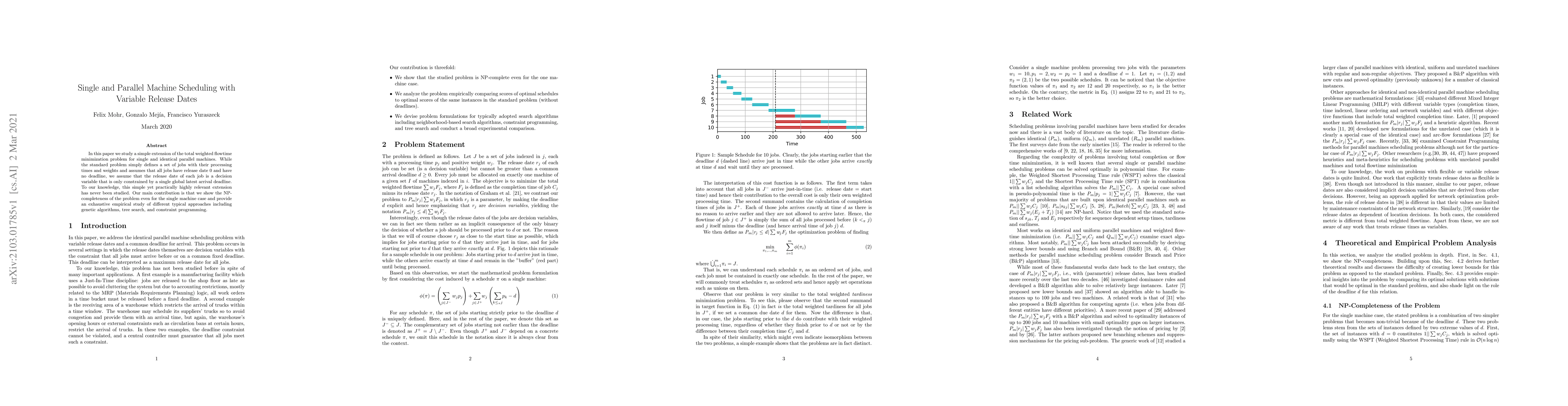This paper explores the NP-completeness of scheduling problems for single and parallel machines with variable job release dates, extending the total weighted flowtime minimization. It provides empirical evaluations of various algorithms including genetic algorithms, tree search, and constraint programming.