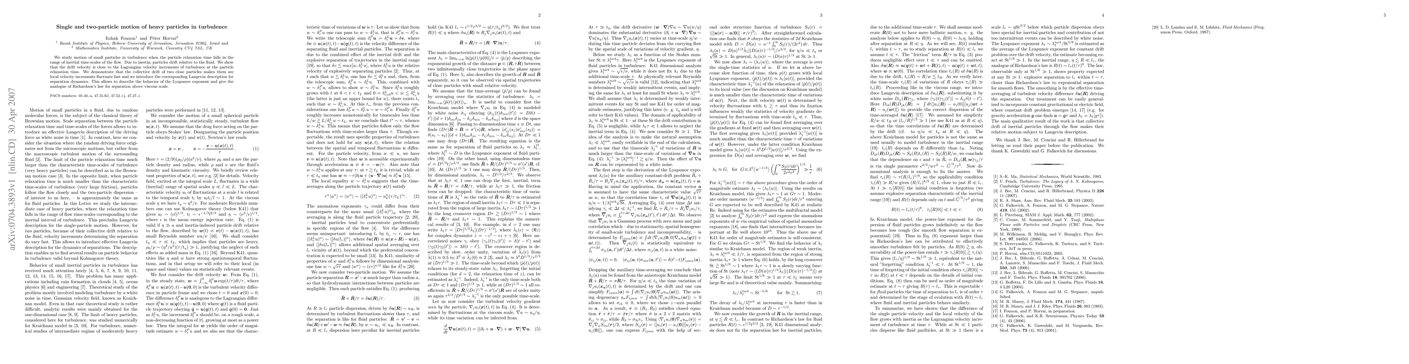 We study motion of small particles in turbulence when the particle relaxation time falls in the range of inertial time-scales of the flow. Due to inertia, particles drift relative to the fluid. We show that the drift velocity is close to the Lagrangian velocity increments of turbulence at the particle relaxation time. We demonstrate that the collective drift of two close particles makes them see local velocity increments fluctuate fast and we introduce the corresponding Langevin description for separation dynamics. This allows to describe the behavior of the Lyapunov exponent and give the analogue of Richardson's law for separation above viscous scale.