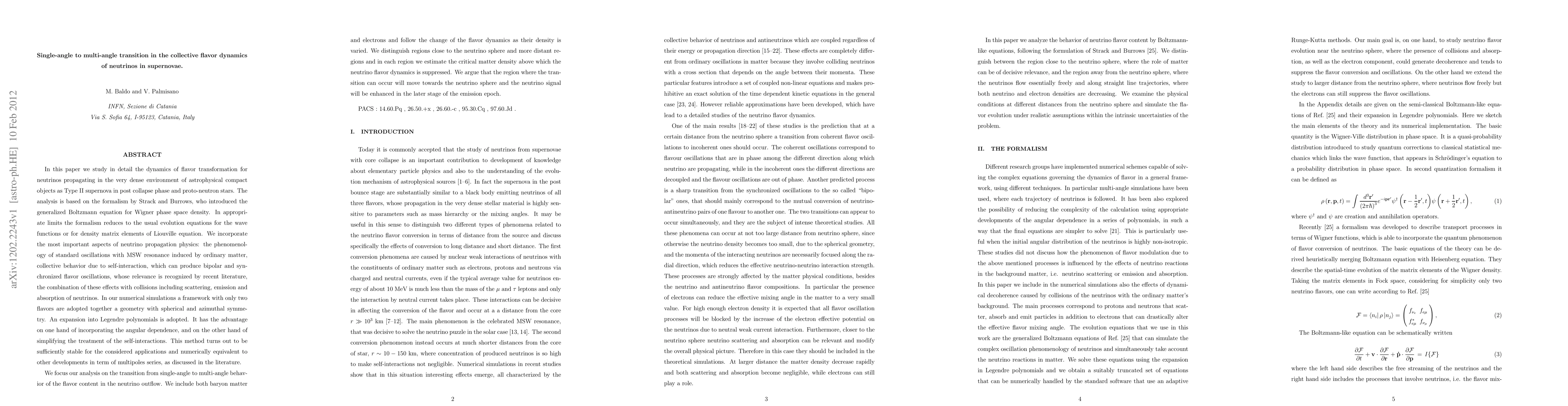 In this paper we study in detail the dynamics of flavor transformation for neutrinos propagating in the very dense environment of astrophysical compact objects as Type II supernova in post collapse phase and proto-neutron stars. The analysis is based on the formalism by Strack and Burrows, who introduced the generalized Boltzmann equation for Wigner phase space density. In appropriate limits the formalism reduces to the usual evolution equations for the wave functions or for density matrix elements of Liouville equation. We incorporate the most important aspects of neutrino propagation physics: the phenomenology of standard oscillations with MSW resonance induced by ordinary matter, collective behavior due to self-interaction, which can produce bipolar and synchronized flavor oscillations, whose relevance is recognized by recent literature, the combination of these effects with collisions including scattering, emission and absorption of neutrinos.