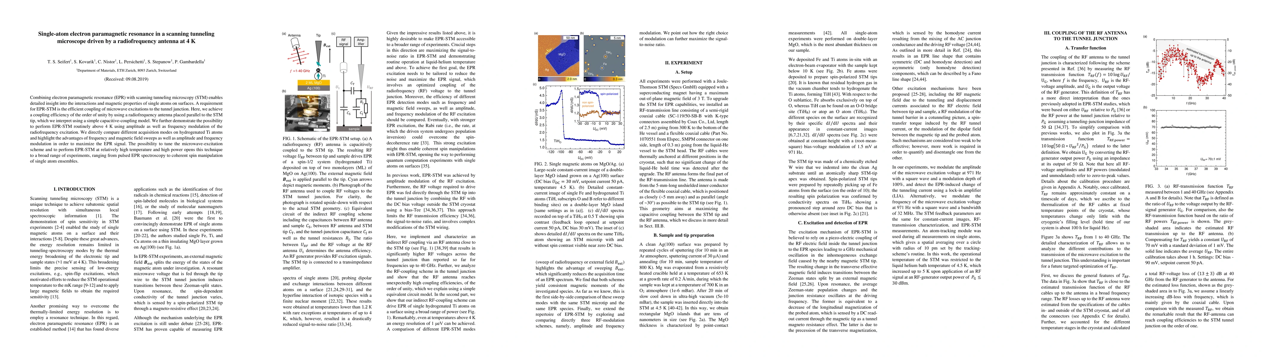 This paper combines electron paramagnetic resonance (EPR) with scanning tunneling microscopy (STM) using a radiofrequency antenna to achieve efficient microwave coupling, enabling high-resolution magnetic property studies of single atoms at 4 K. The study demonstrates the technique's adaptability to higher temperatures and various acquisition modes, broadening its experimental applications.