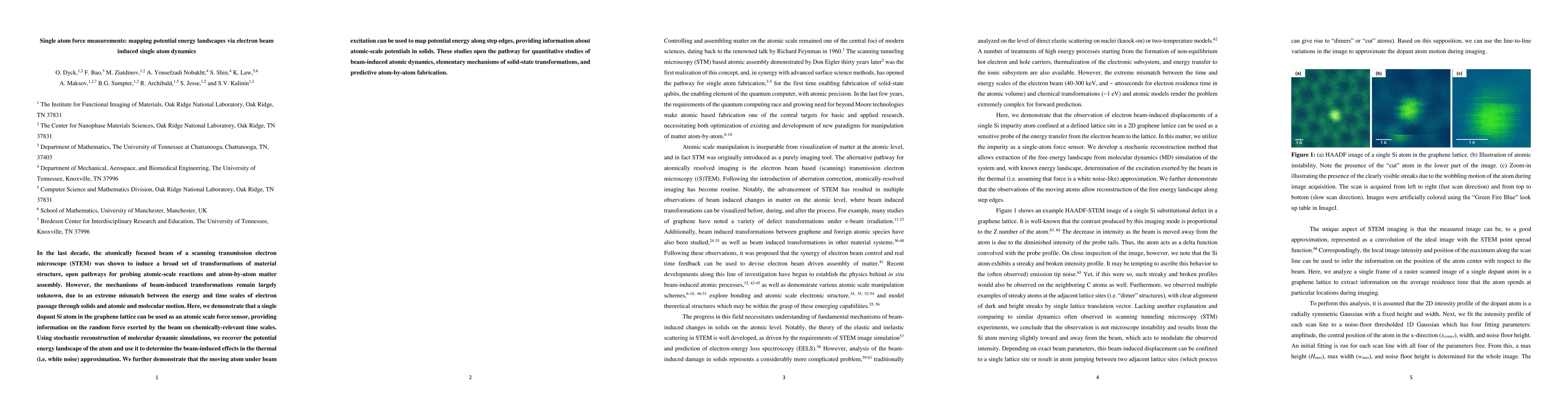The paper presents a method to use a single dopant Si atom in graphene as a force sensor to measure beam-induced effects, combined with stochastic reconstruction of molecular dynamics simulations to recover potential energy landscapes and determine beam-induced effects.
