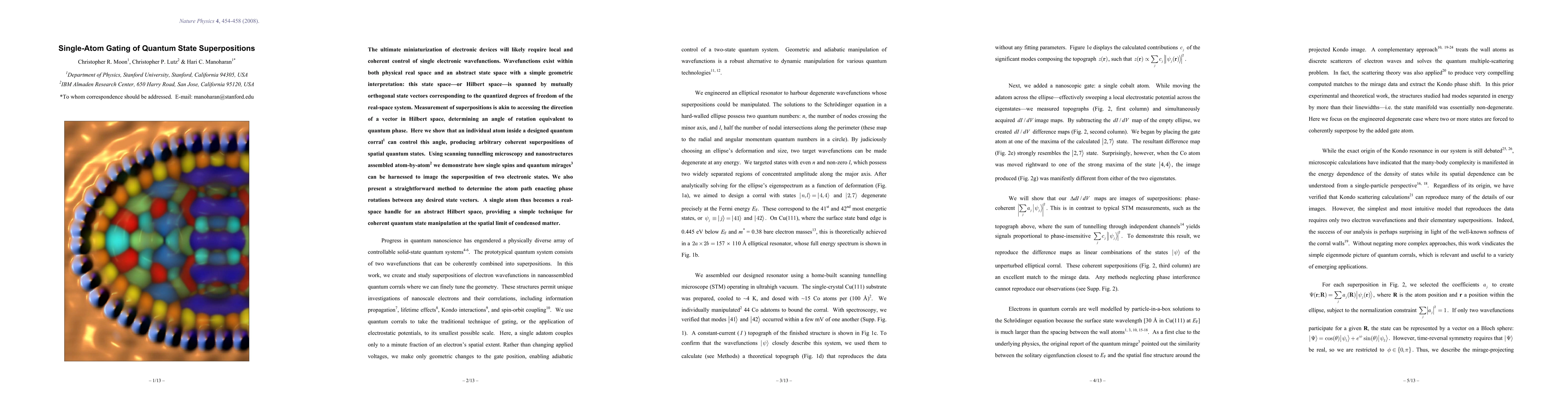 This paper demonstrates that a single atom within a quantum corral can control the quantum phase and superposition of electronic states, using scanning tunneling microscopy to manipulate and image these states. The method provides a practical approach for coherent quantum state manipulation at the atomic scale.